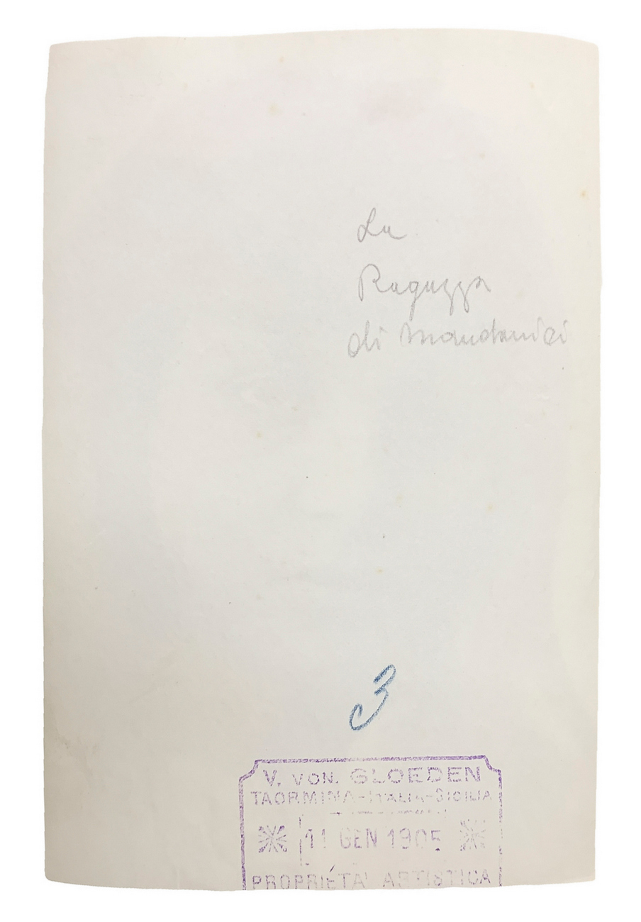 Wilhelm von Gloeden (1856-1931), foto all'albumina raffigurante primo piano di ragazza siciliana. Numerata sul retro 3 e