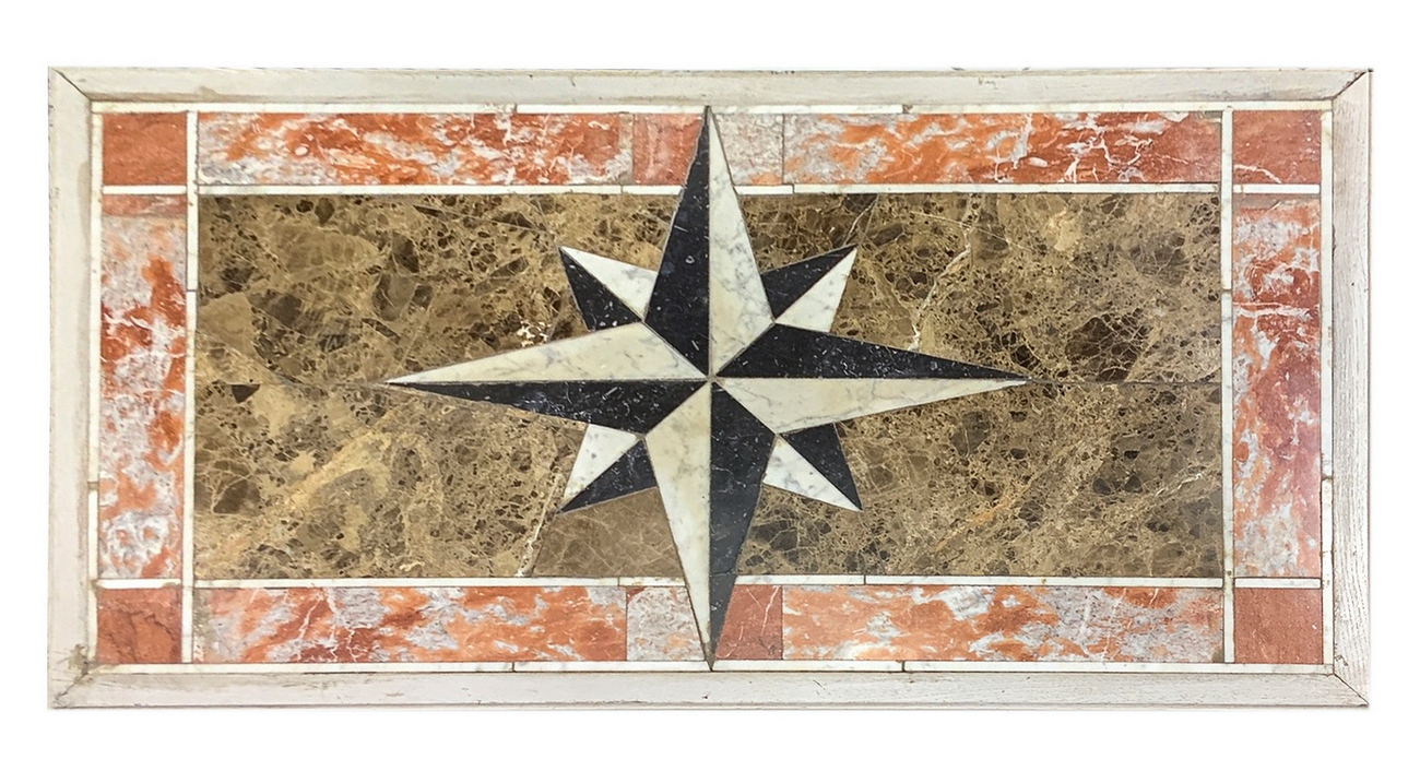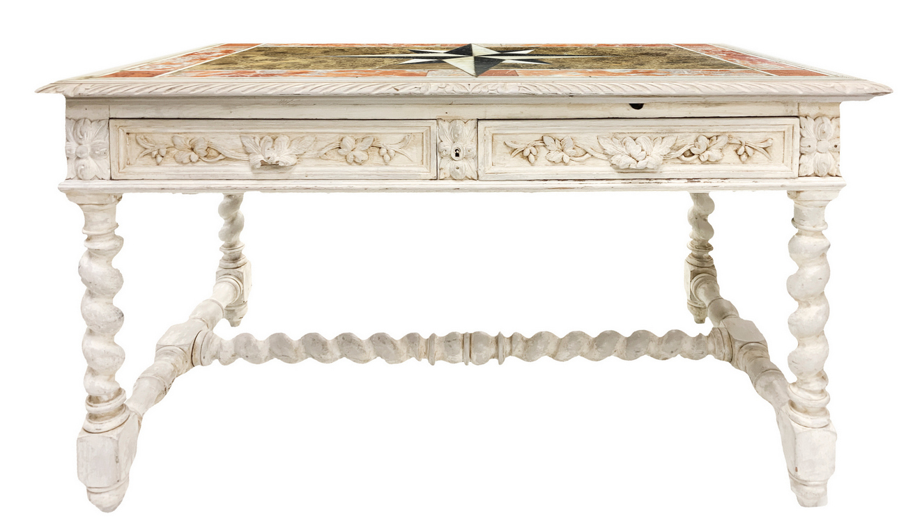Scrittoio shabby chic laccato bianco con marmo, due cassetti alla base, piedi a torchon su mobile del XIX secolo. Marmo intarsiato con la rosa dei venti al piano . Piccole mancanze. H cm 76xcm 130x75
