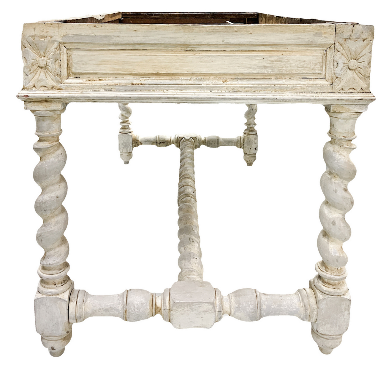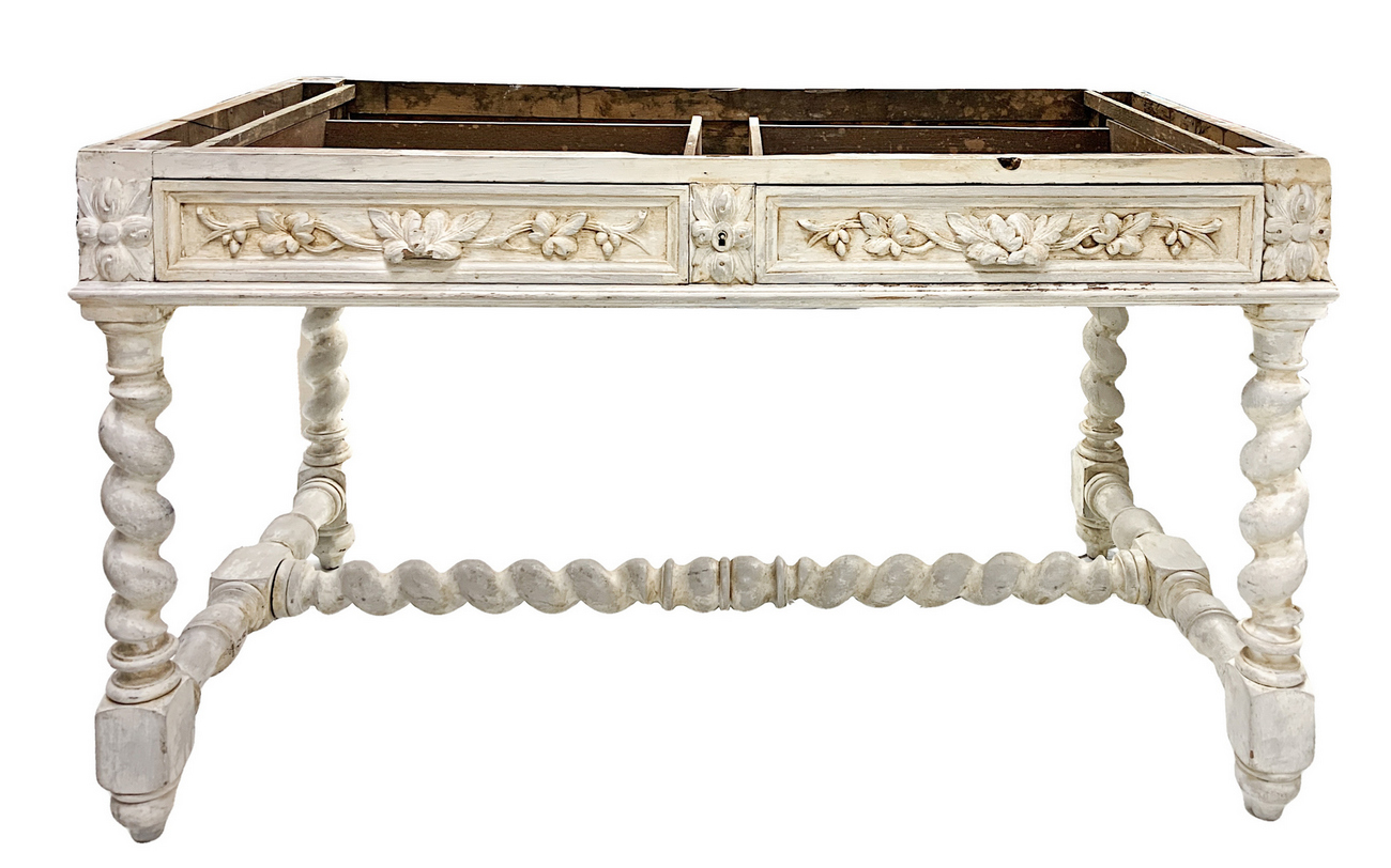 Scrittoio shabby chic laccato bianco con marmo, due cassetti alla base, piedi a torchon su mobile del XIX secolo. Marmo