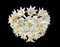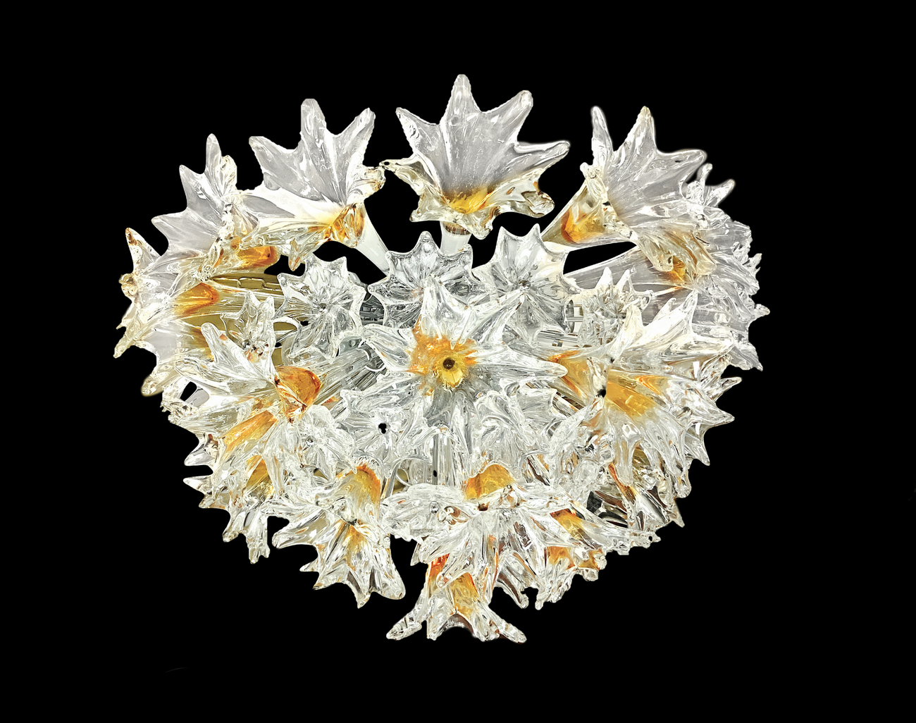 Venini, modello Esprit, Lampada a plafone , struttura in metallo cromato, elementi fitomorfi in vetro e inclusioni nei toni del pagliesco . Diametro cm 60, h cm 35, 12 luci