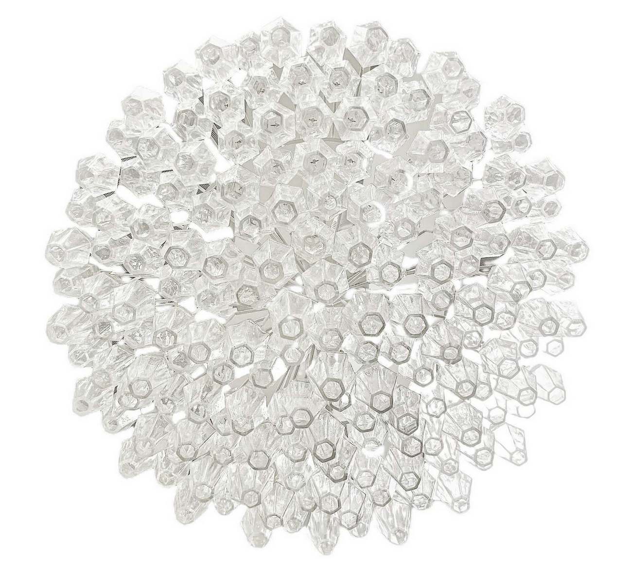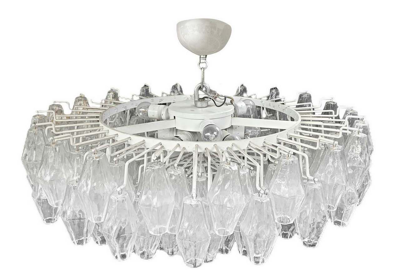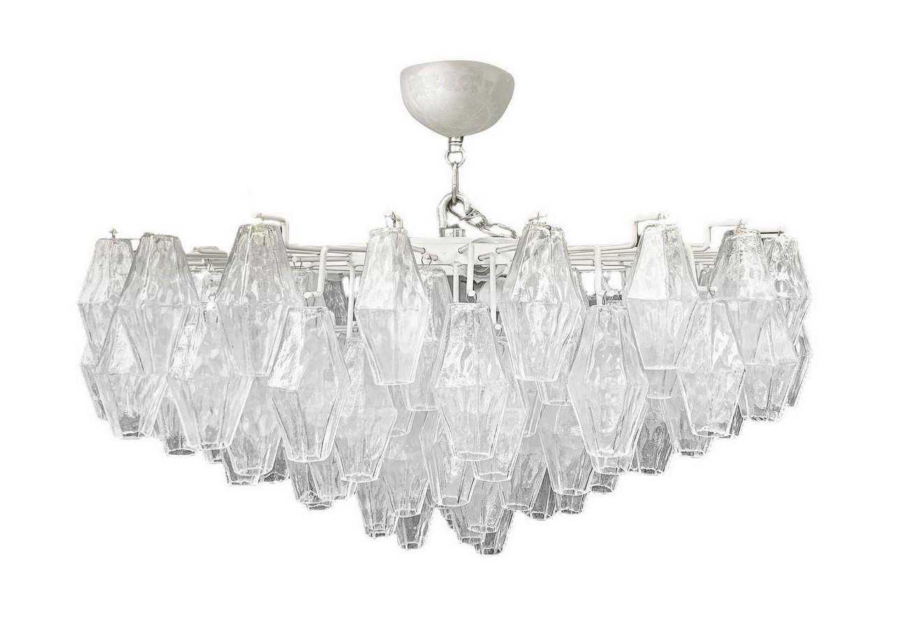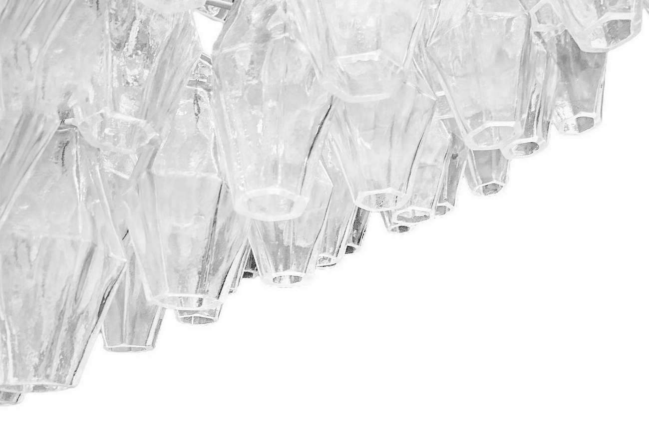 Produzione Muranese, nello stile Carlo Scarpa/Venini. Lampada a sospensione con struttura in metallo cromato ed elementi in vetro trasparente di forma poliedrica. Segni di ossidazione lungo la struttura. Anni ’70. Diametro cm 85, h cm 35