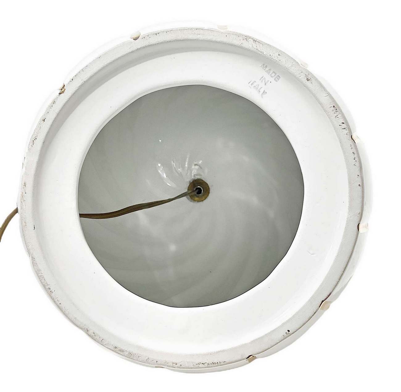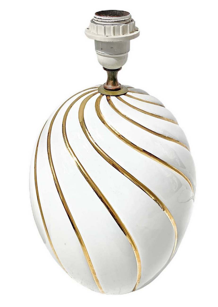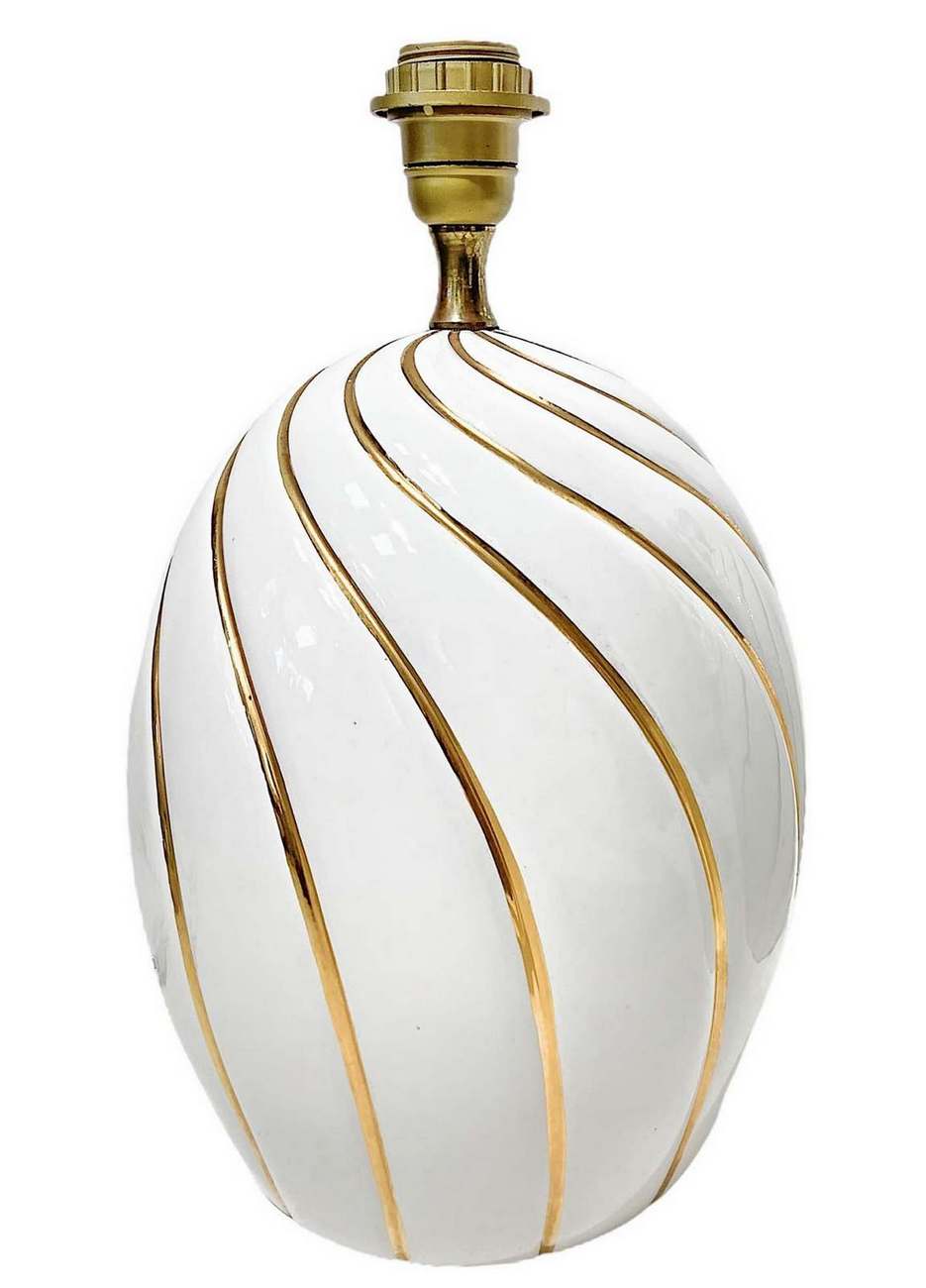 Coppia di abat jours in porcellana bianca, prod italiana. Superficie riportante dettagli in oro. Anni ‘70. H cm 39. Diametro cm 22