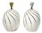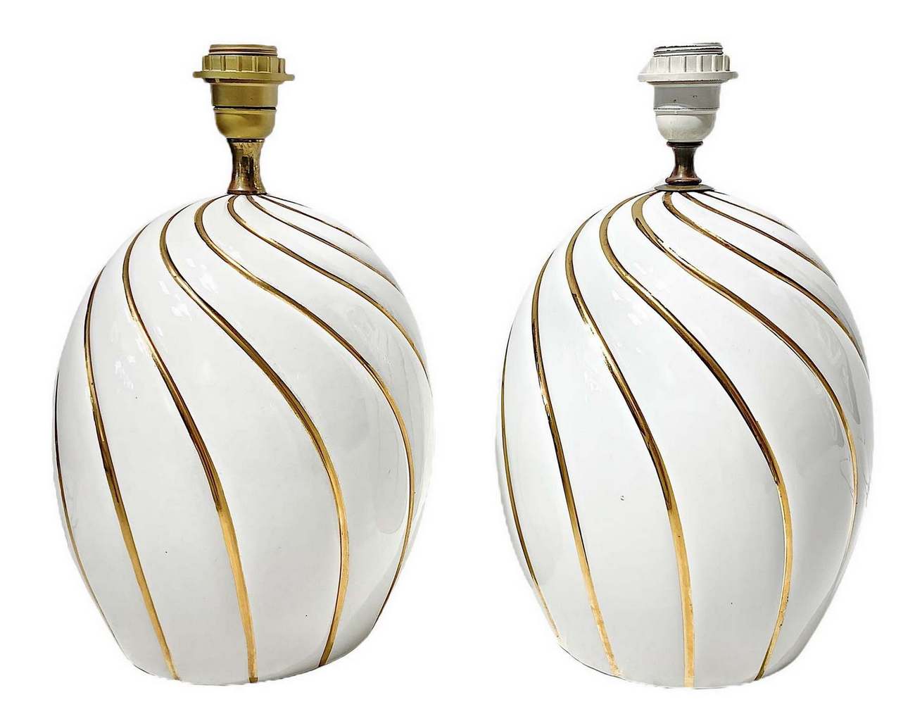 Coppia di abat jours in porcellana bianca, prod italiana. Superficie riportante dettagli in oro. Anni ‘70. H cm 39. Diam