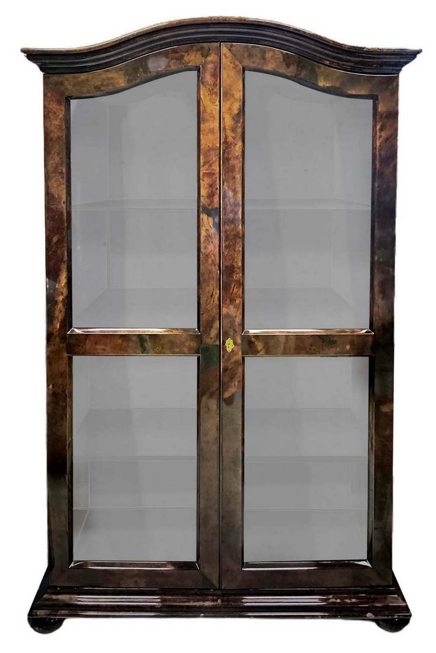 Prod.Aldo Tura, Vetrina a giorno con struttura in legno rivestimento in pergamena acrilicata nei toni del marrone, inter
