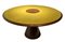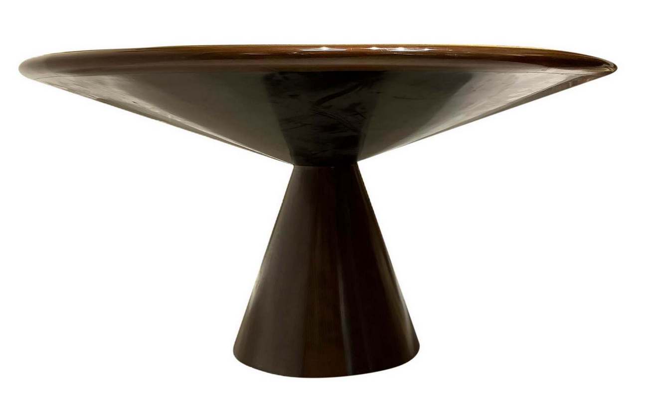 Produzione italiana nello stile di Angelo Mangiarotti. Importante tavolo con struttura in legno impiallacciata noce e finitura lucida. Piede tronco conico e piano rotondo rivestito in panno nei toni del senape. Segni di uso. Anni 70. D 135 cm, h 70 cm