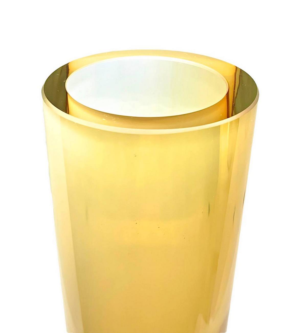 Vaso in vetro iridescente nei toni del pagliesco, di forma globulare con alto collo e bordo molato nello stile Barovier & Toso, Murano. H cm 30.