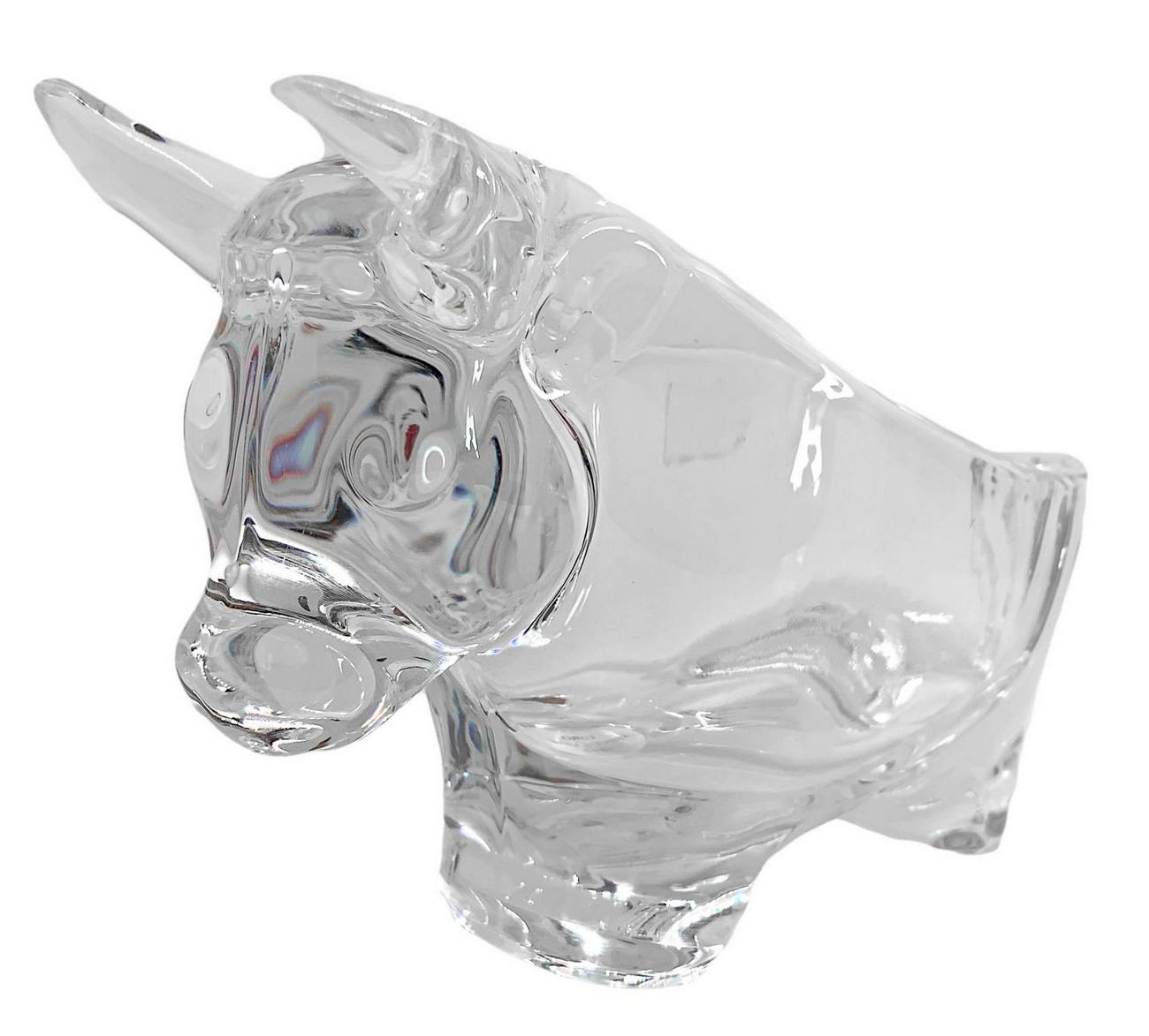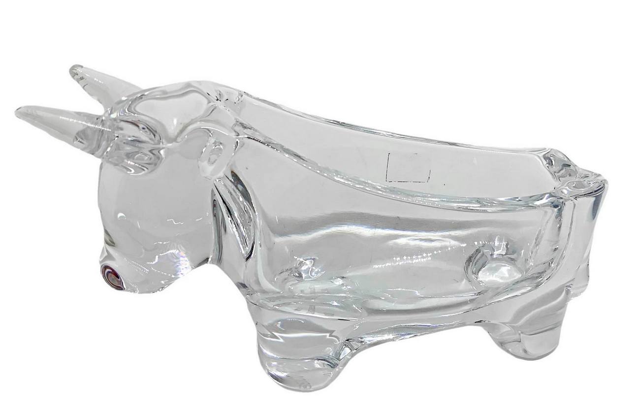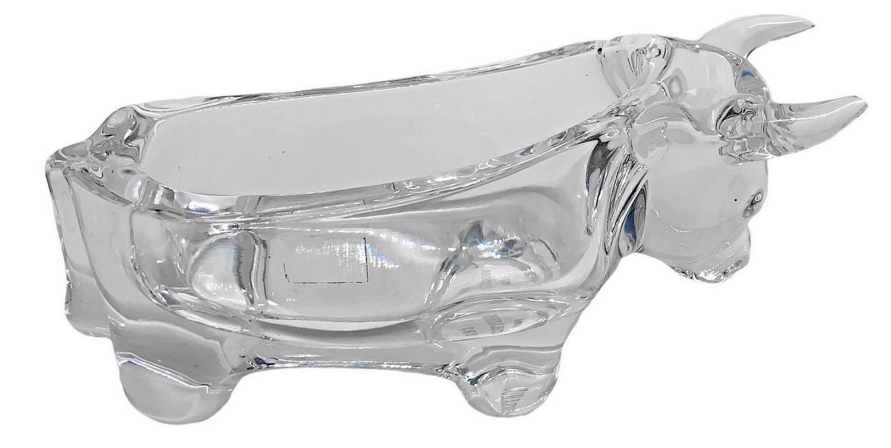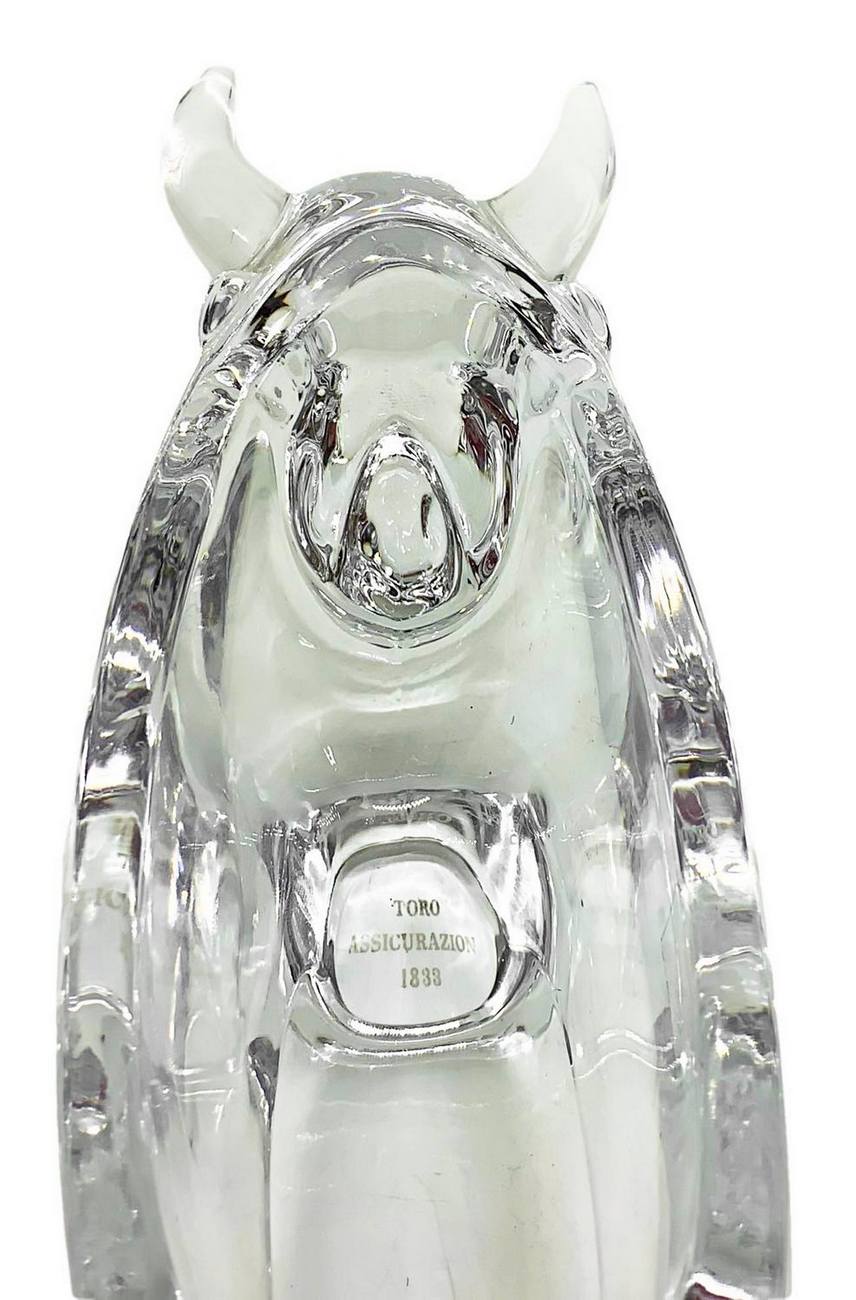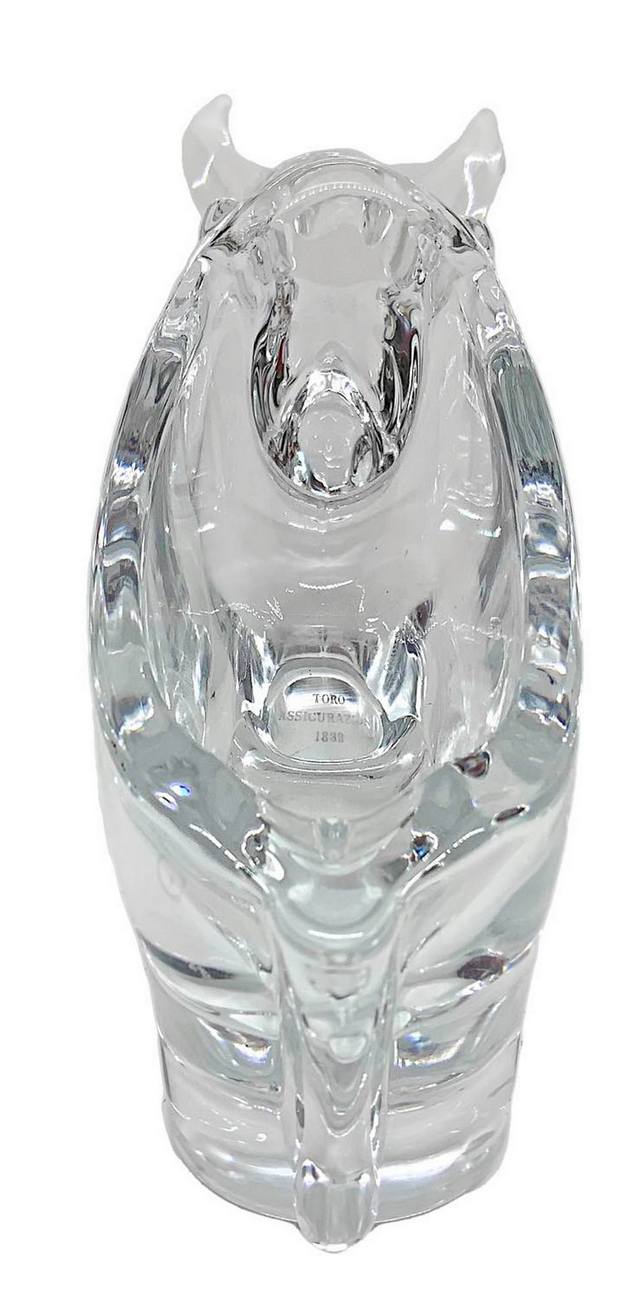 Posacenere in cristallo raffigurante toro stilizzato. Sulla base riportata dicitura “Toro assicurazioni 1833”. H 9,5 x 17. Piccola sbeccatura su corno