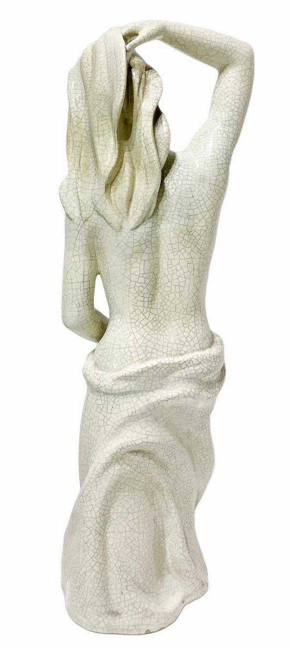 Le Bertetti, scultura in pasta bianca effetto craquele raffigurante donna bagnante con drappo, firmato sulla base Le Bertetti Torino Italia, Emanuela n° 80. H cm 60, larghezza cm 16. Anni ‘50