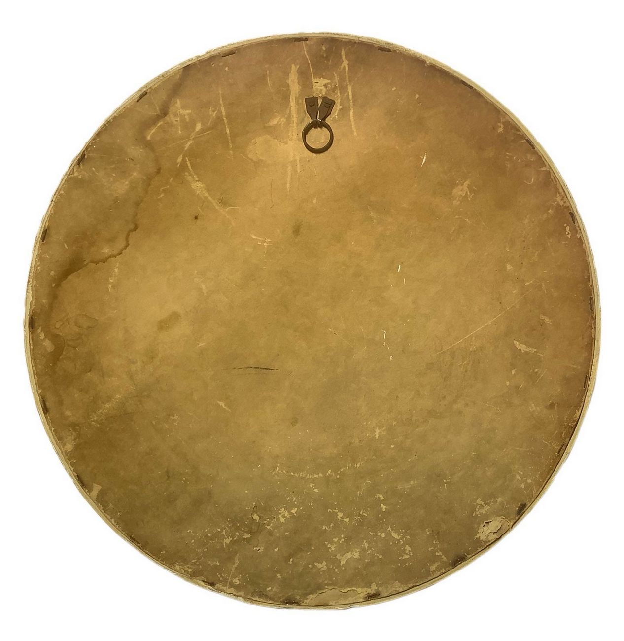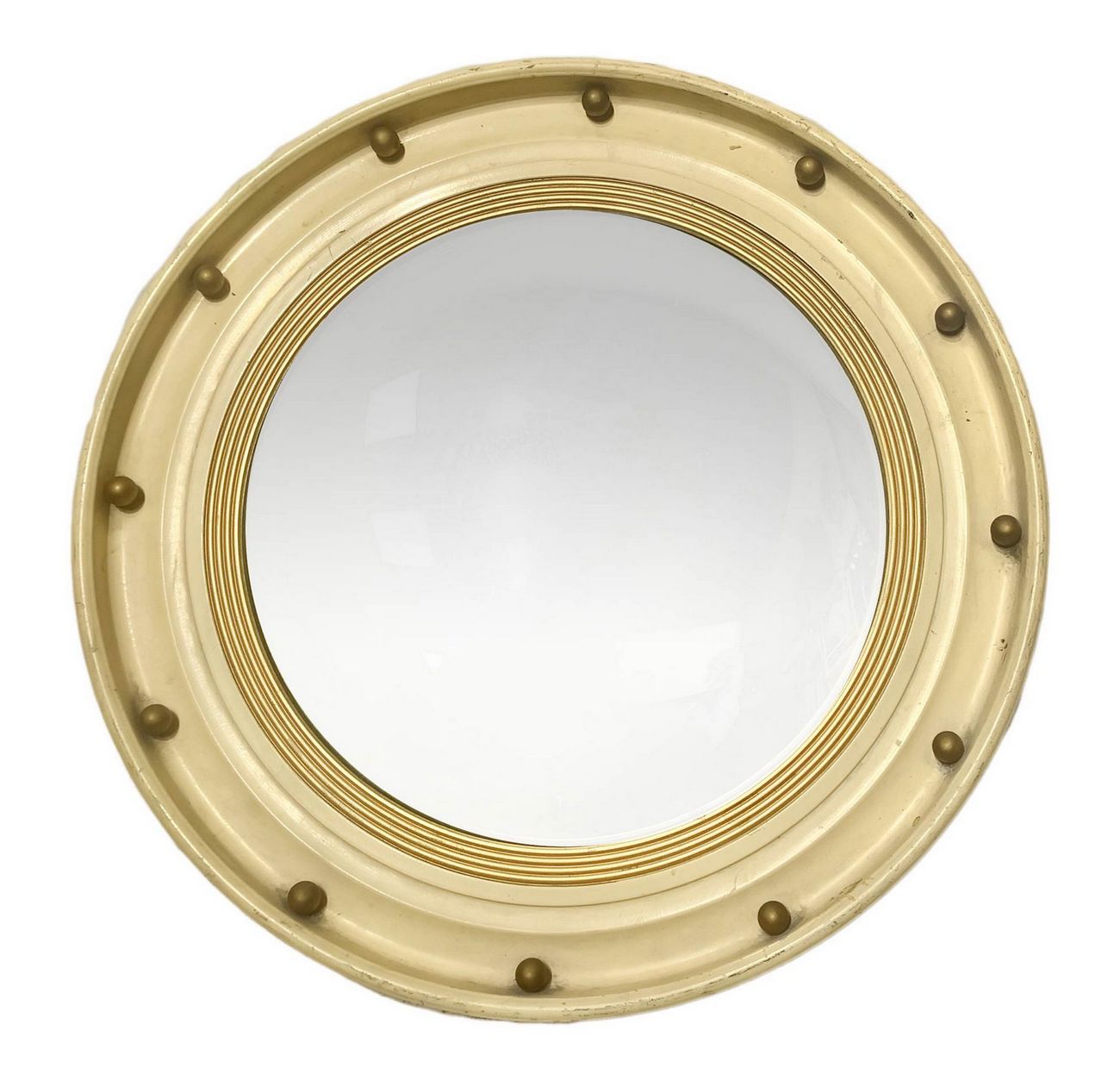 Specchiera in legno di forma circolare laccata nei toni dell'avorio. Dettagli dorati e specchio convesso, nello stile dell'Atelier Borsani (Varedo), anni '40. Diametro cm 50.