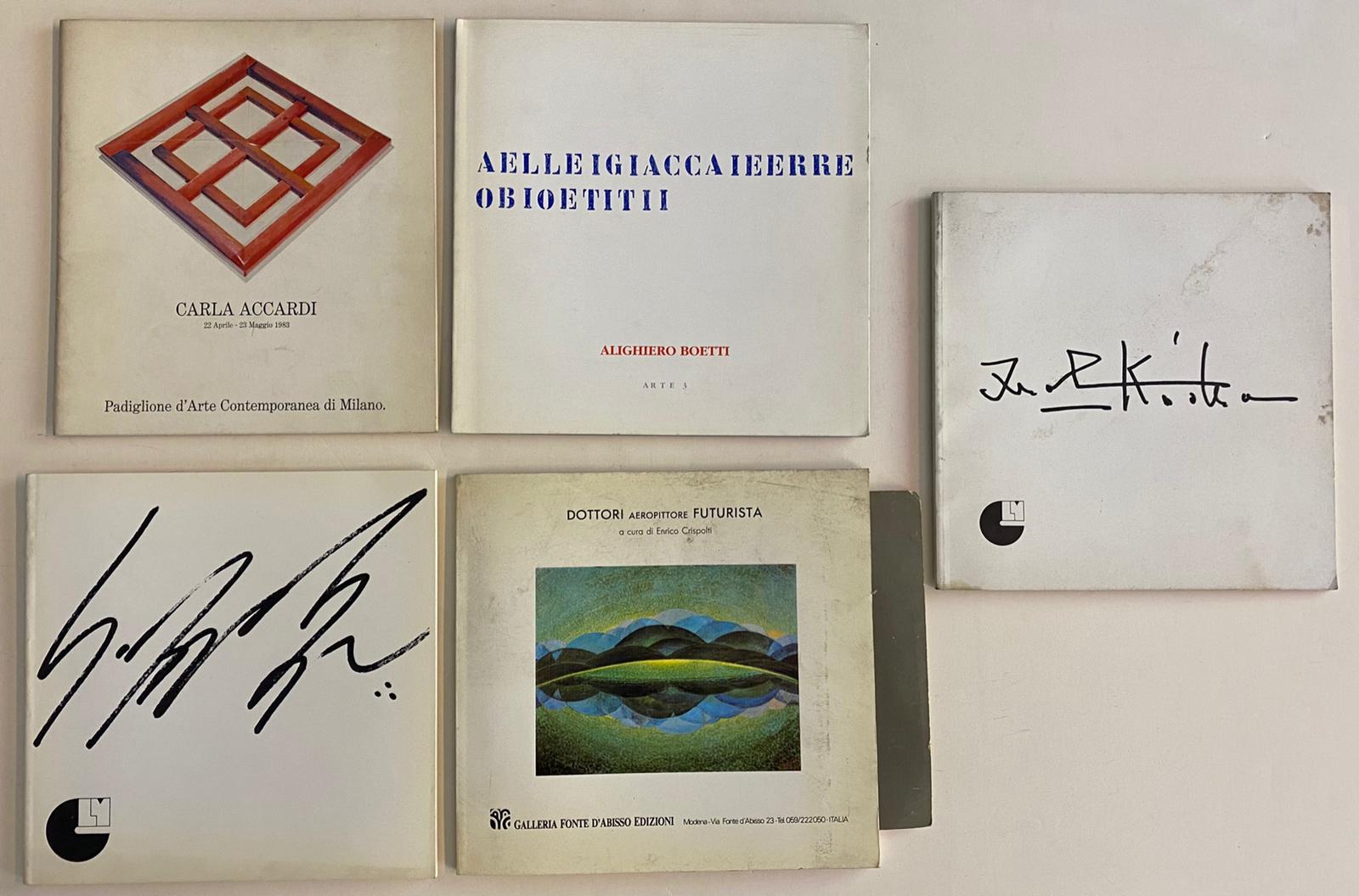 Carla Accardi, 1983 Catalogo riccamente illustrato, edito in occasione della mostra dedicata all’artista, presso il Padiglione d’Arte Contemporanea, Milano, 1983 Padiglione d’Arte Contemporanea, Milano Cm 21x19 Alighiero Boetti, 1999 Catalogo riccamente illustrato, edito in occasione della mostra dedicata all’artista, presso Arte 3, Milano, 1999 Arte 3, Milano Cm 21x21Sergio Dangelo. Colomba al neon, 1988 Catalogo riccamente illustrato, edito in occasione della mostra dedicata all’artista, presso il Centro d’Arte Lino Malagnini, Saronno, 1988 Centro d’Arte Lino Malagnini, Saronno Cm 20x20Dottori aeropittore futurista, 1983 Catalogo riccamente illustrato, a cura di Enrico Crispolti, edito in occasione della mostra dedicata all’artista, presso la Galleria Fonte d’Abisso Edizioni, Modena, 1983 Galleria Fonte d’Abisso Edizioni, Modena Cm 19x21 Pag 59Kodra. Il fantastico nell’arte, 1983 Catalogo riccamente illustrato, edito in occasi, edito in occasione della mostra dedicata all’artista, presso il Centro d’Arte Lino Malagnini, Saronno, 1988 Centro d’Arte Lino Malagnini, Saronno Cm 20x20