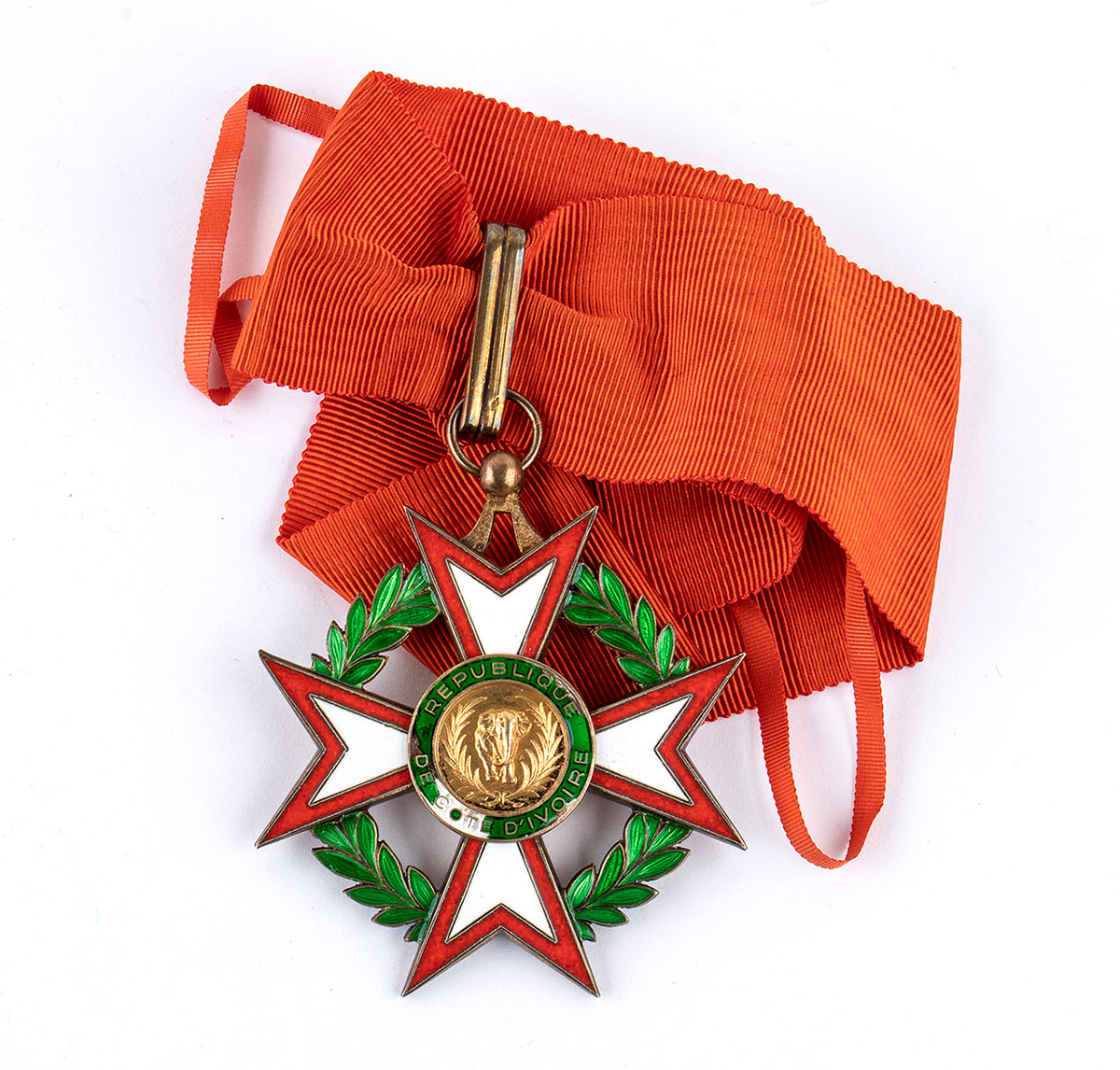Repubblica della Costa d'Avorio, Ordine Nazionale, insegna di Commendatore. insegna di commendatore, metallo dorato, nastro in seta, difetti agli smalti
