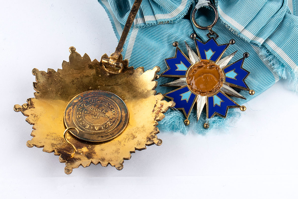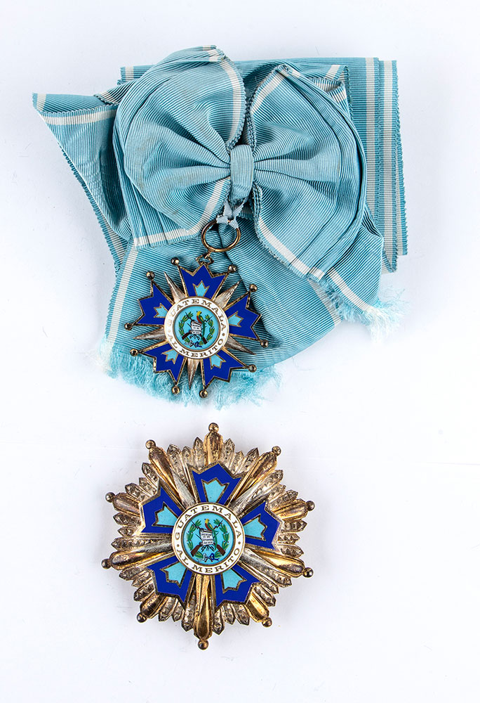 Guatemala, Ordine del Quetzal, insegna di Gran CroceEnamels, silver,9X9 cm, 6X6 cm Bella placca con fascia in seta marezzata e pendente dell’Ordine del Quetzal, argento e smalti, al pendente della fascia manca il centrale posteriore