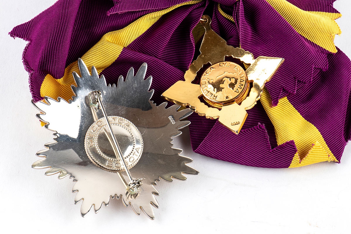 Panama, Ordine di Vassco Nunez, Gran Croce Insegna di Gran Croce, placca in argento punzonata 0900, applicazione centrale in smalti , al verso spilla centrale e placchetta con marchi del fabbricante, MECO LTDA, Bogotà, pendente in argento dorato me smalti
