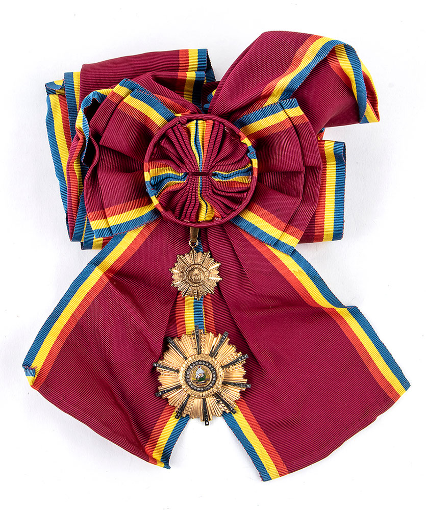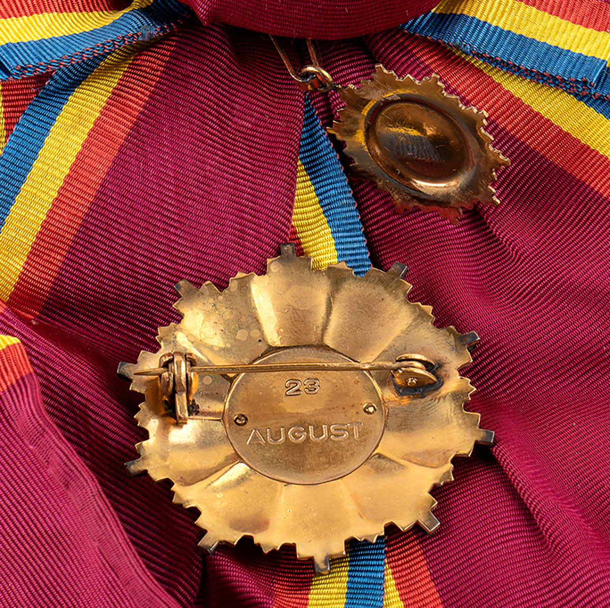Repubblica Socialista di Romania, Ordine del 23 Agosto, insegna di Gran Croce placca in metallo dorato con inserti in argento e piccoli diamanti, smalti in ottimo stato, pendente in metallo dorato con fascia in seta marezzata con i colori della RS di Romania