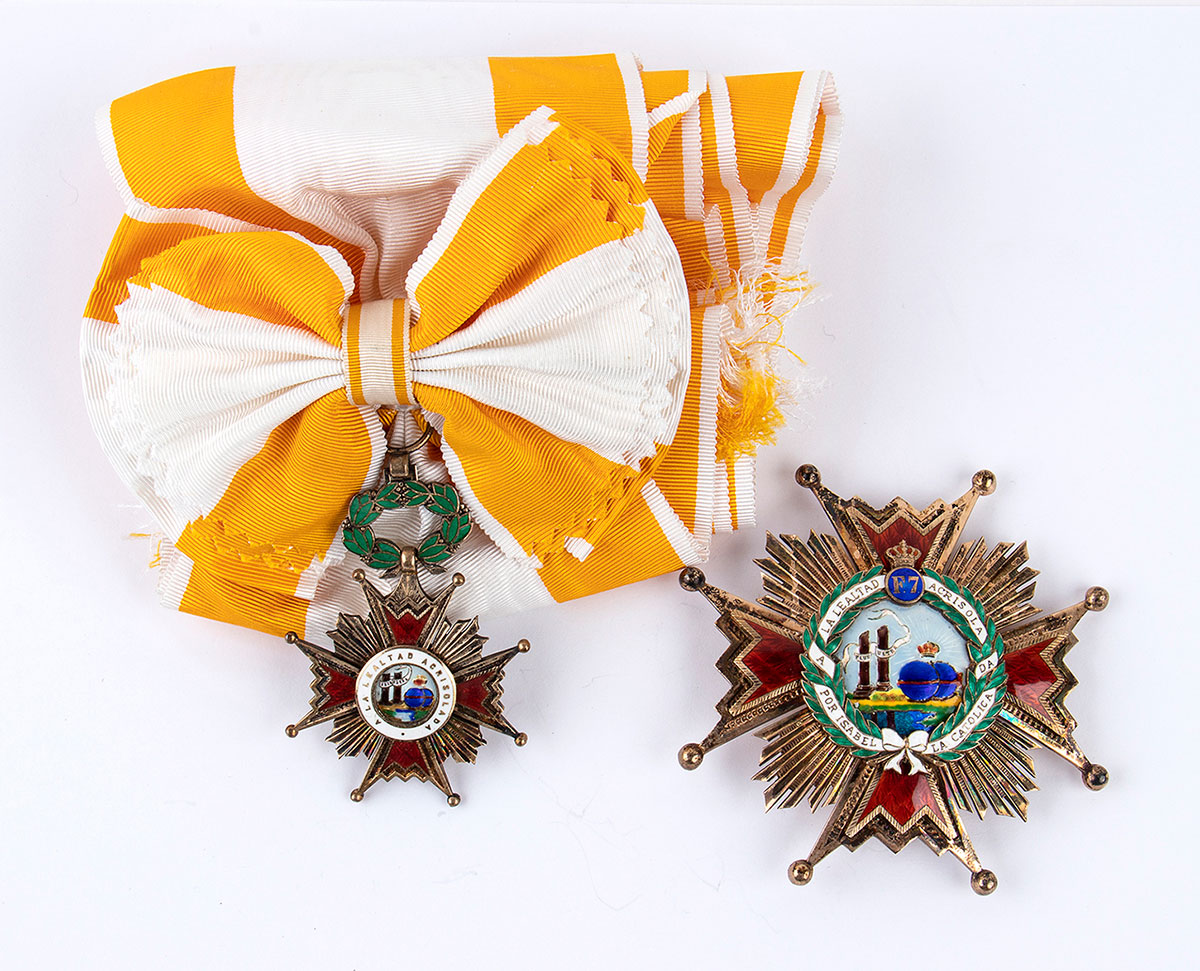 SPAGNA, ORDINE DI ISABELLA LA CATTOLICA, Gran Croce Insolito set di Gran Croce dell’Ordine di Isabella la cattolica, la placca è del tipo in uso fino al 1931, il pendente della fascia di misura ridotta e del periodo Frazncisco Franco, la placca è di ottima fatturain nove pezzi saldati con applicato scudo centrale in smalti con le colonne d’Ercole, al verso spillone centrale con doppi ardiglioni laterali, il pendente della fasciain argento e smalti di ottima fattura