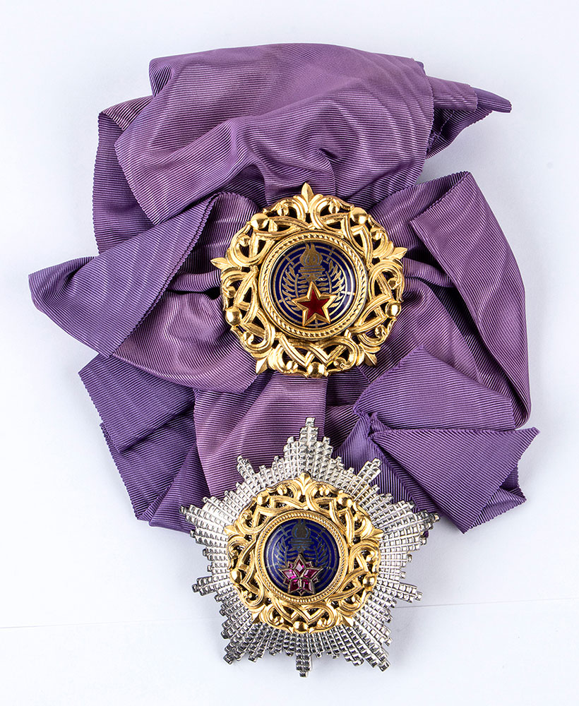 Yugoslavia, Ordine della Stella di yugoslavia, set di gran croce Set di Gran Croce,placca in argento in quattro pezzi, centrale in smalto azzurro con stella rossa con gioie, pendente con fascia in argento dorato e smalti.Molto rara.