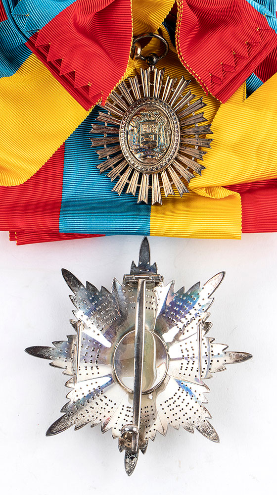 Venezuela, Ordine di Simon Bolivar, insegna di Gran Croce Insegna do gran croce, placca in argento cesellato a sfaccettature e traforato, con applicato centrale in argento dorato e smalti, pendente con raggiera in argento dorato e medaglione centrale in smalti