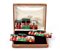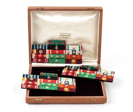 Scatola contenente tre petti di nastrini Scatola in legno contenente tre petti di nastrini di medaglie con montatura anni 80 del XX sec., i nastri sono quelli che portava M. P. Fanfani sulla divisa della CRI