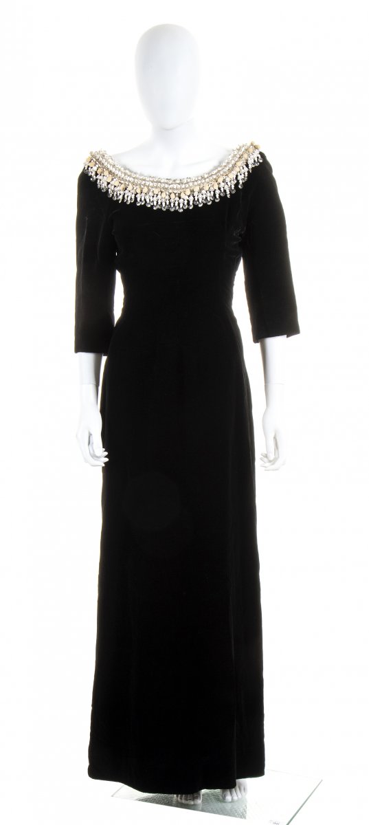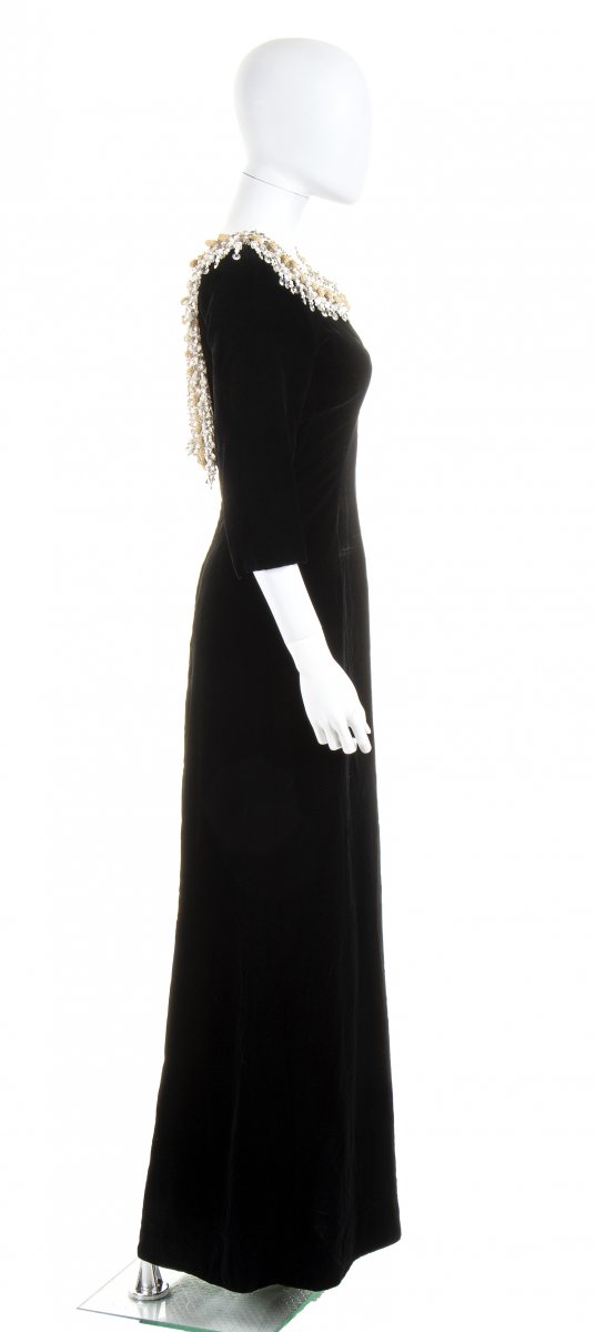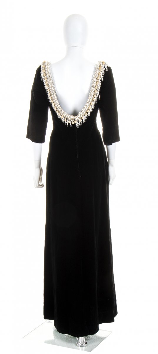 Inizio anni ‘60 Abito da sera in velluto nero, scollo decorato con importante bordo di perline