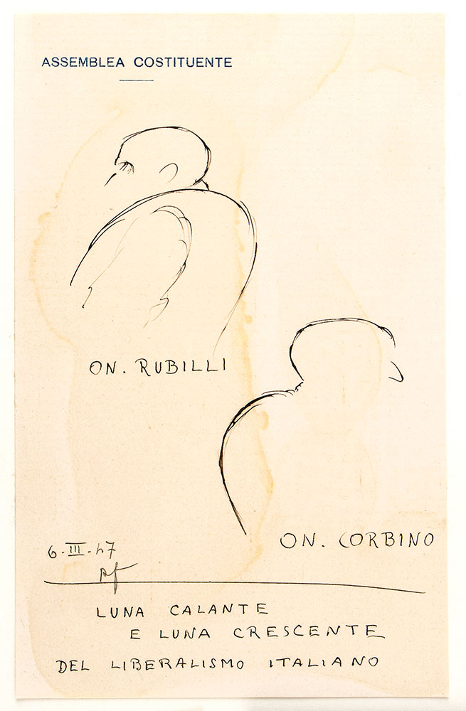 FANFANI, Amintore - Vignette e disegni - anni '40 - (Pieve Santo Stefano, 6 febbraio 1908 – Roma, 20 novembre 1999) Vignetta dal titolo "LUNA CALANTE LUNA CRESCENTE - del liberalismo italiano", firmata, 6 Marzo 1947. Caricature degli onorevoli Rubilli, Corbino. Su carta intestata Assemblea Costituente