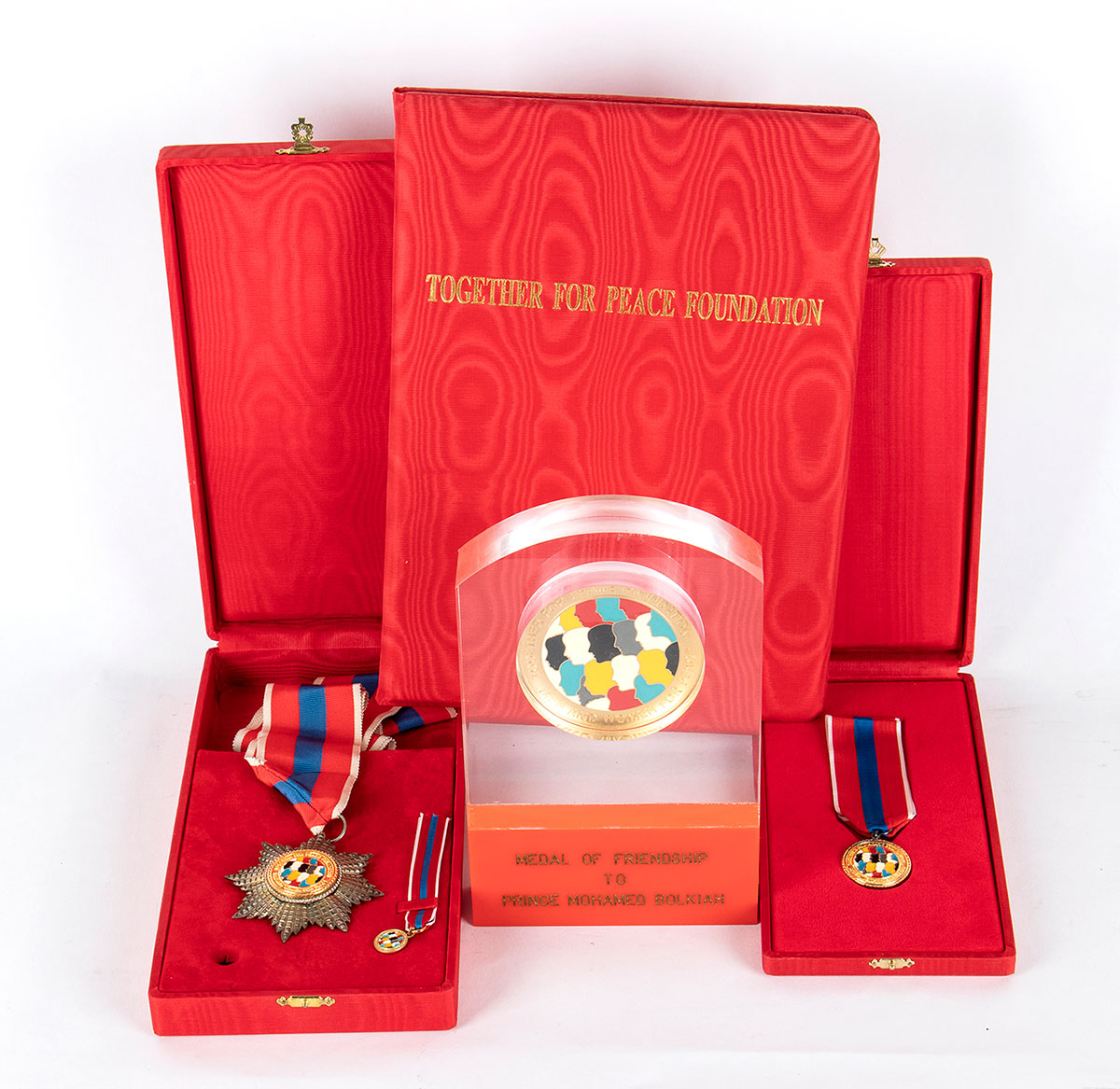 Together For Peace Foundation - Onorificenze e vario Lotto composto da una onorificenza per Commendatore ed una per Cavaliere in argento ed argento dorato, in scatole originali, con cartellina per attestato (vuota) e riconoscimento al PRINCIPE MOHAMED BOLKIAH - TOGETHER FOR PEACE FOUNDATION