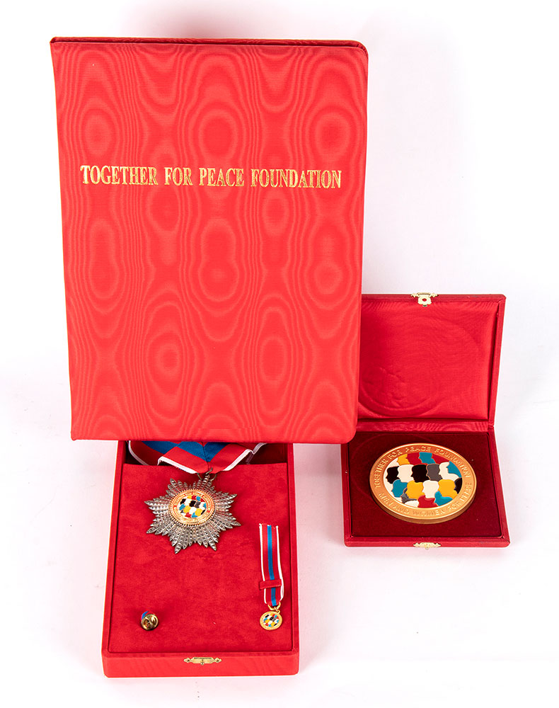 Together For Peace Foundation - Onorificenze e vario Lotto composto da una onorificenza per Commendatore in argento ed un medaglione, in scatole originali, con cartellina per attestato (vuota)
