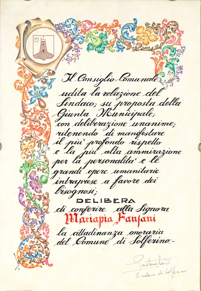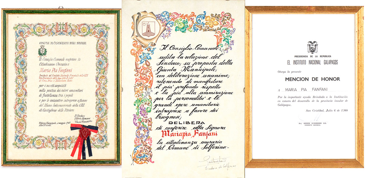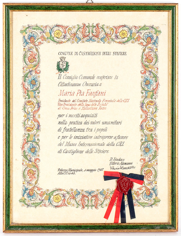 Cittadinanza onoraria Lotto composto da tre differenti attestati per Maria Pia Fanfani, di cittadinanze onorarie tra cui Castiglione delle Stiviere, Solferino