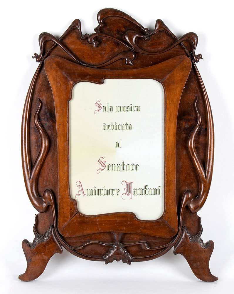 Targa in Legno per SALA MUSICA Grande cornice in legno sagomato, stile liberty, con pergamena dipinta a mano che recita "Sala Musica dedicata al Senatore Amintore Fanfani"