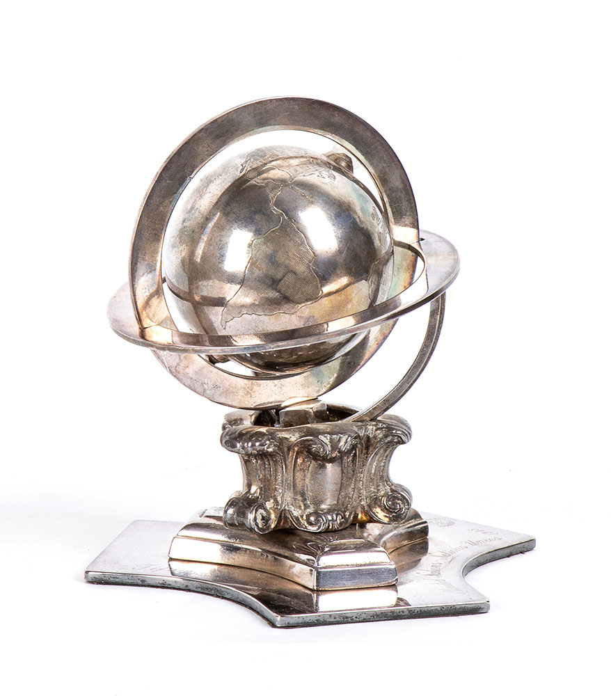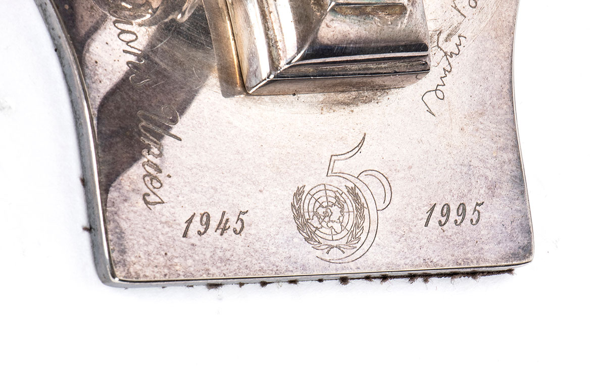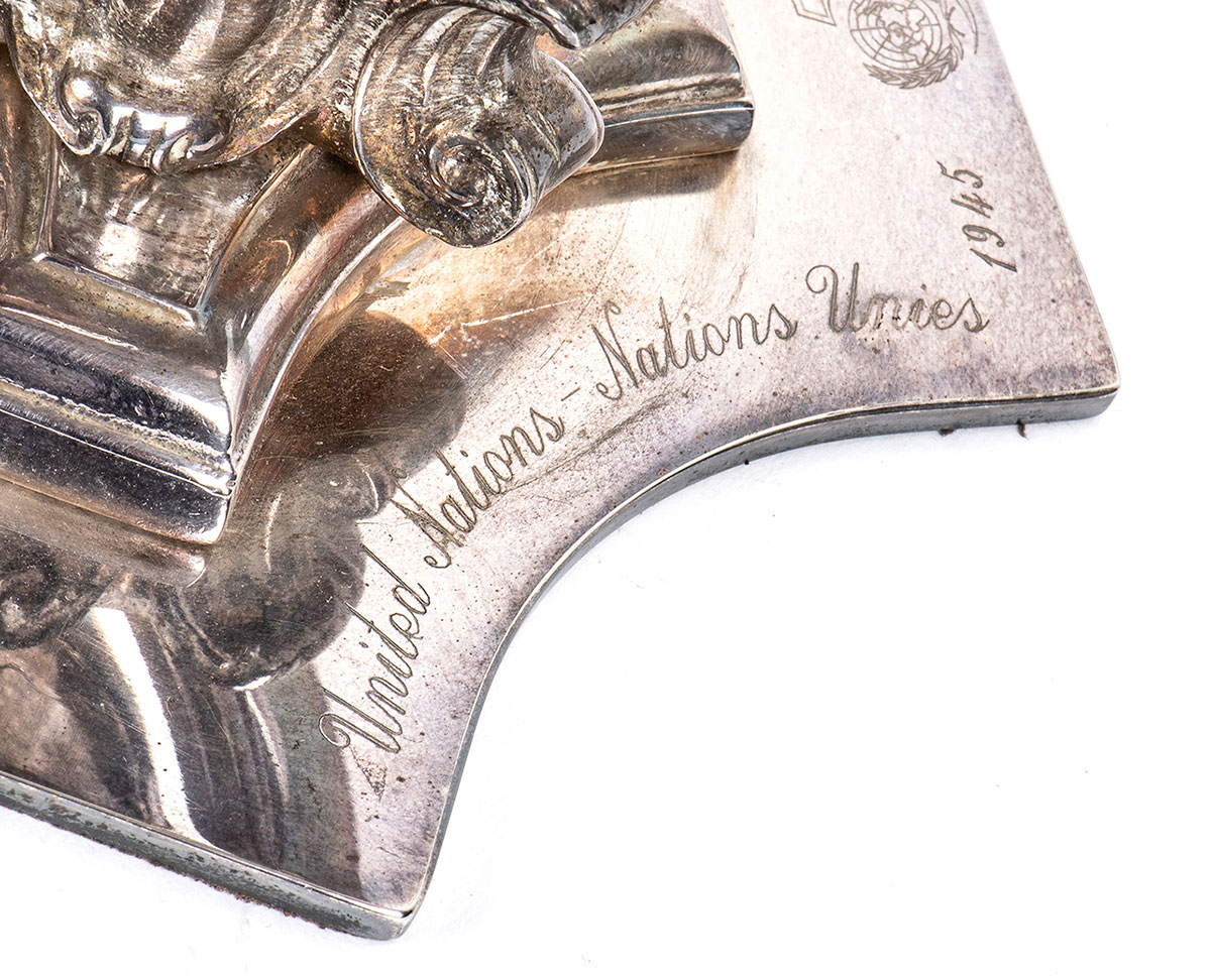 Riconoscimenti vari a Maria Pia Fanfani (Pavia, 29 novembre 1922 – Roma, 7 novembre 2019) Scultura in argento, mappamondo su base a capitello, cinquantenario delle Nazioni Unite, United Nations 1945 1995, firmato alla base, realizzato su disegno di Maria Pia Fanfani come riportato sul fondo