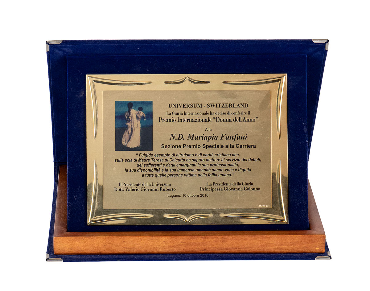 Riconoscimenti vari Targa commemorativa Premio Internazionale "Donna dell'anno" a Maria Pia Fanfani, Lugano 10 Ottobre 2010. Lamierino placcato in oro 24k