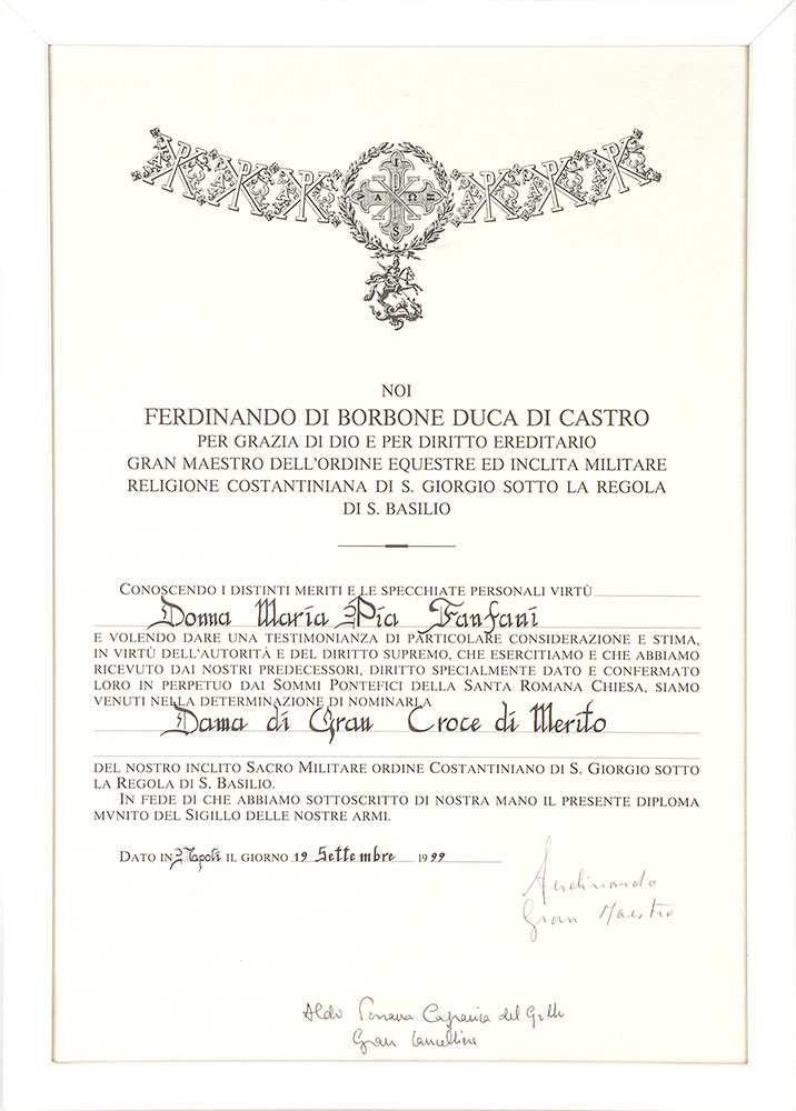 Riconoscimenti vari, borbonica Attestato di Dama di Gran Croce di Merito dell'Ordine Costantiniano di San Giorgio sotto la regola di S.Basilio assegnata a Maria Pia Fanfani a Napoli il 19 Settembre 1999, firmato Ferdinando (Duca di Castro)
