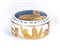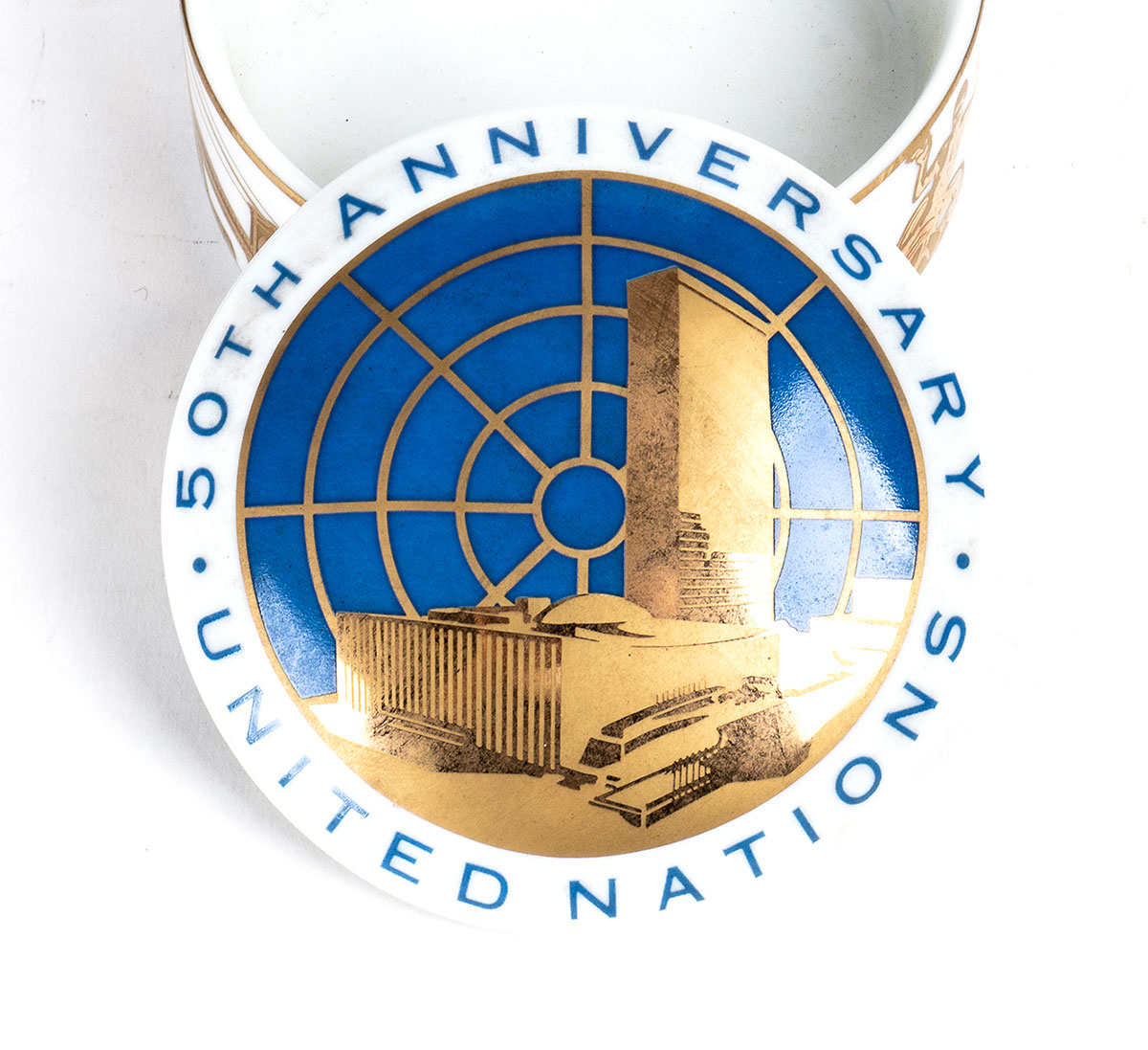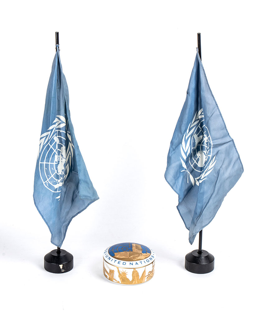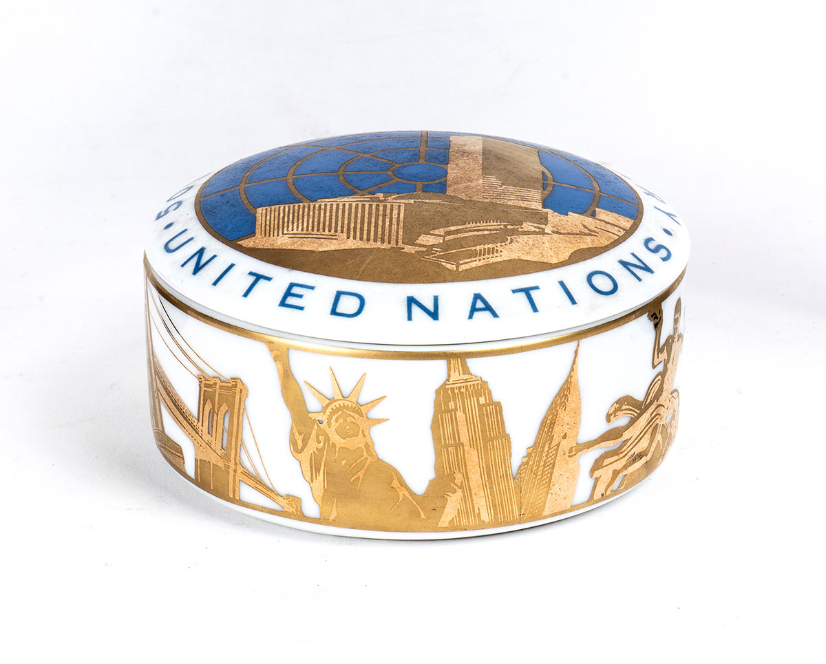 Oggetti vari Lotto composto da scatolina tonda in ceramica marcata TIFFANY alla base, commemorativa per il 50' Anniversario di fondazione delle Nazioni Unite, con disegni dello skyline di New York a smalti blu e oro, e due bandierine ONU da scrivania con relativo supporto