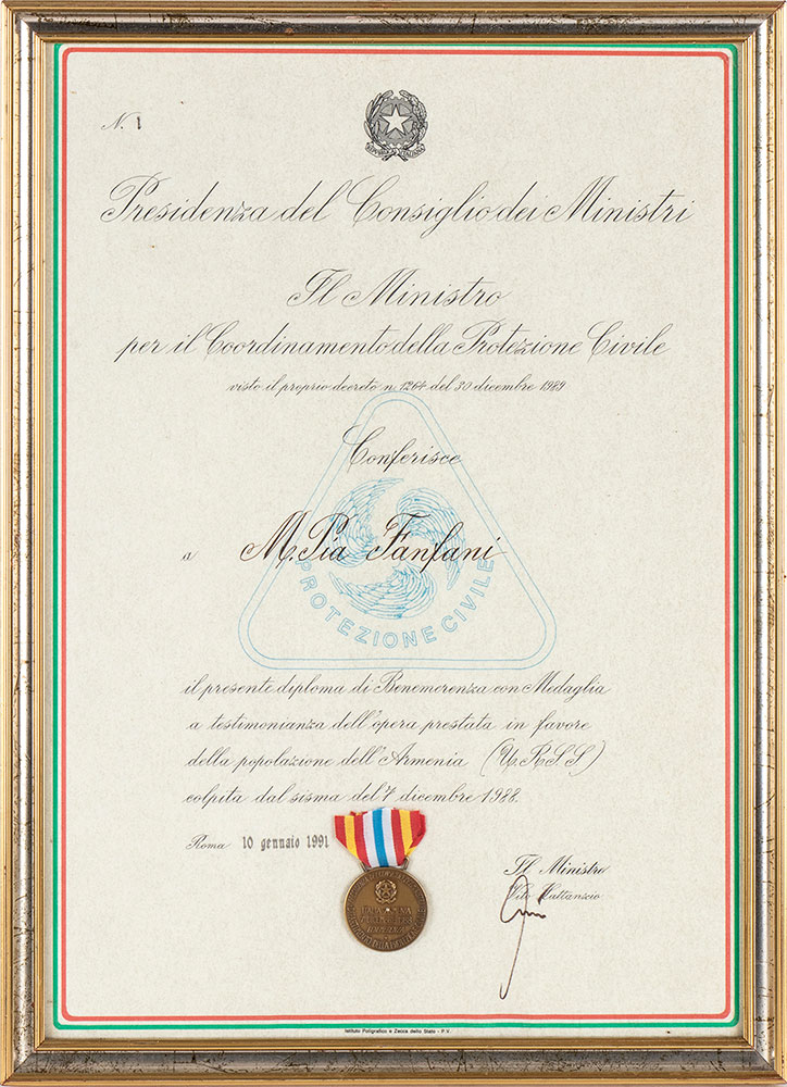 Riconoscimenti vari a Maria Pia Fanfani (Pavia, 29 novembre 1922 – Roma, 7 novembre 2019) Attestato e medaglia per Maria Pia Fanfani di BENEMERENZA per l'opera prestata alla popolazione dell'Armenia per il sisma del Dicembre 1988, a firma VITO LATTANZI Ministro del Coordinamento della Protezione Civile