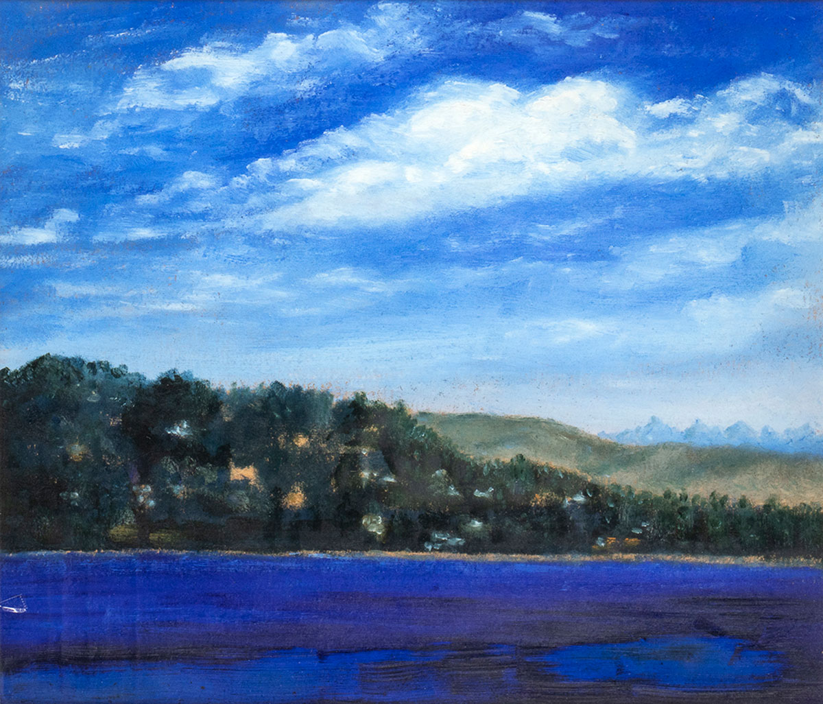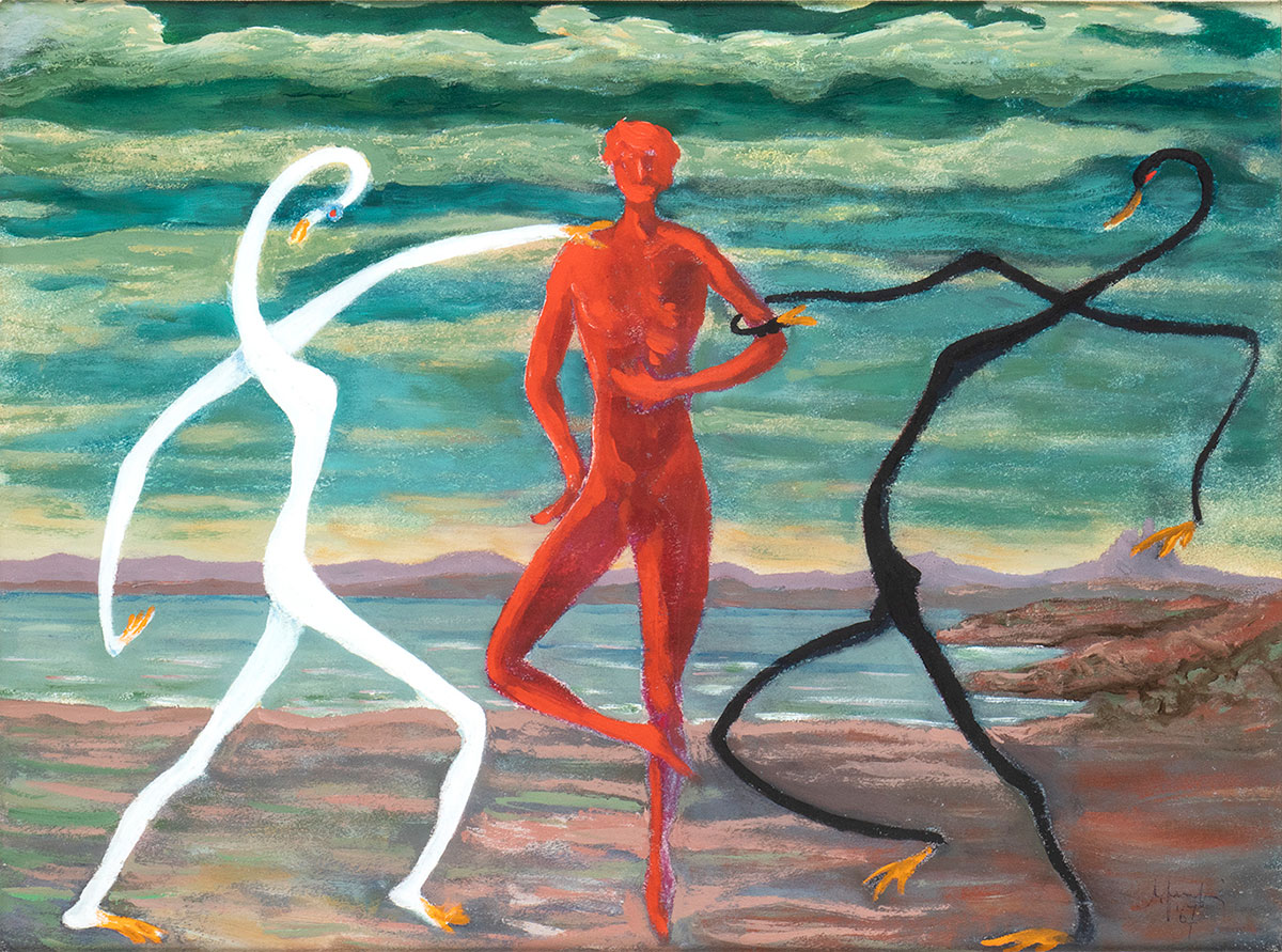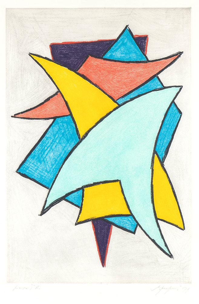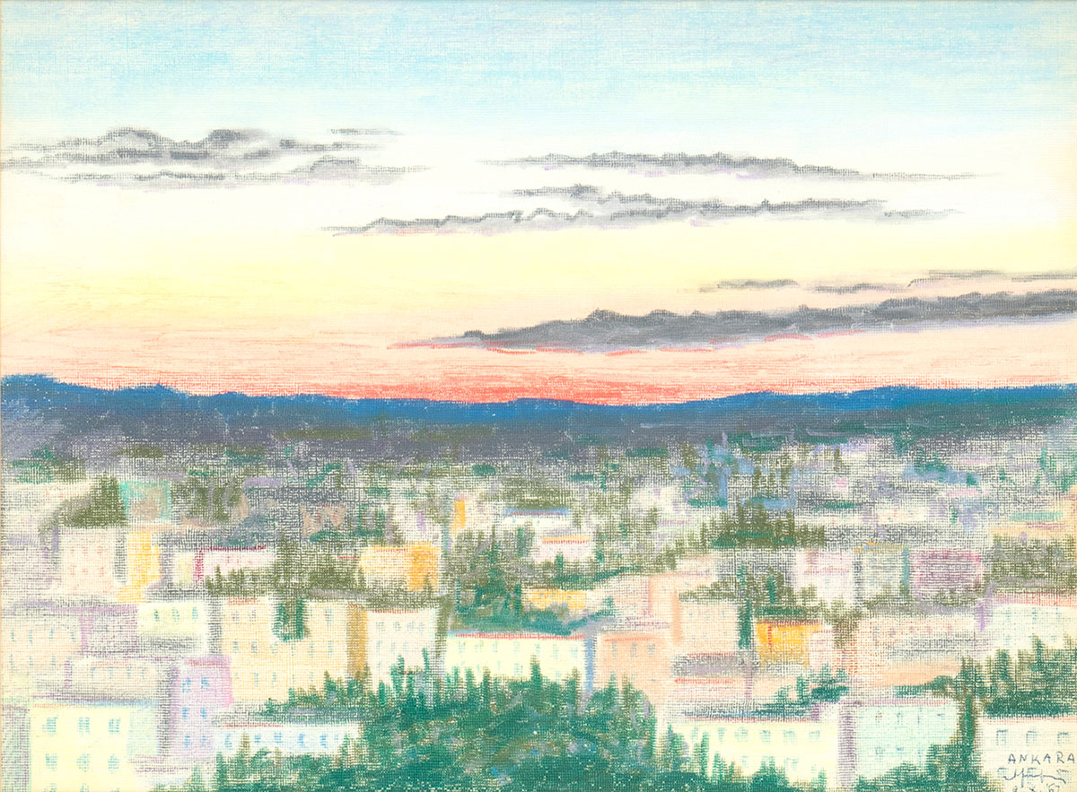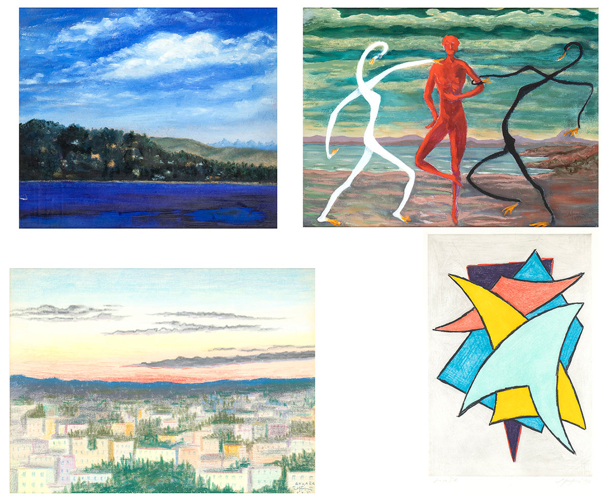 FANFANI, Amintore (Pieve Santo Stefano, 6 febbraio 1908 – Roma, 20 novembre 1999) Lotto di quattro composizioni originali firmate Amintore Fanfani "Cannes" olio su tavoletta 1968, "Lago dei cigni" pastello su carta 1967, "Ankara" tempera su cartone telato 1967, "Composizione" lito a colori prova d'artista 1979. In cornice