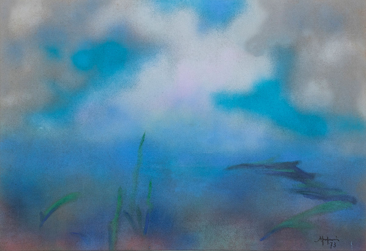 FANFANI, Amintore (Pieve Santo Stefano, 6 febbraio 1908 – Roma, 20 novembre 1999) Composizione originale firmata Amintore Fanfani "Laguna" acrilico ad aerografo su cartoncino telato, 1973. In cornice