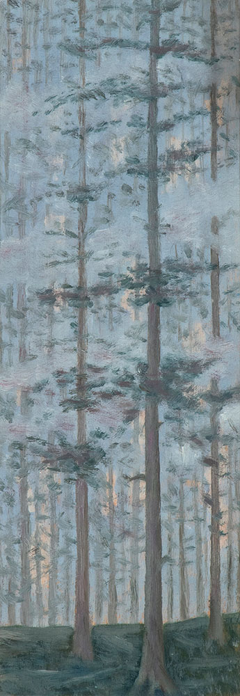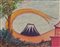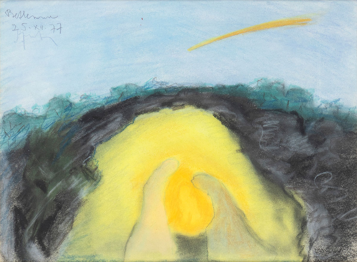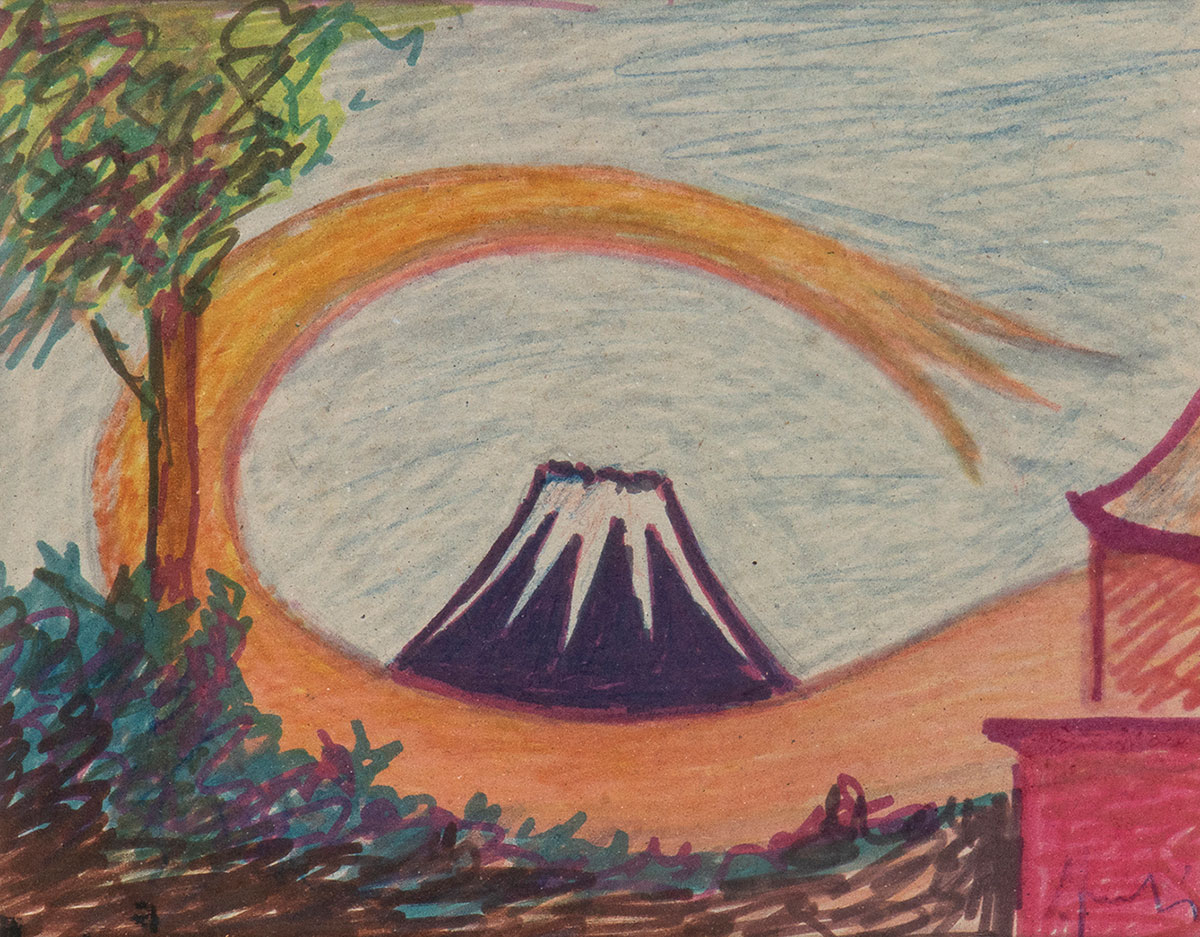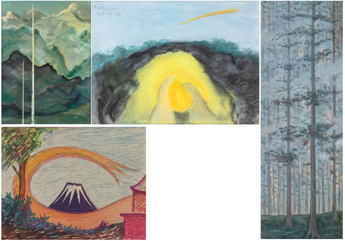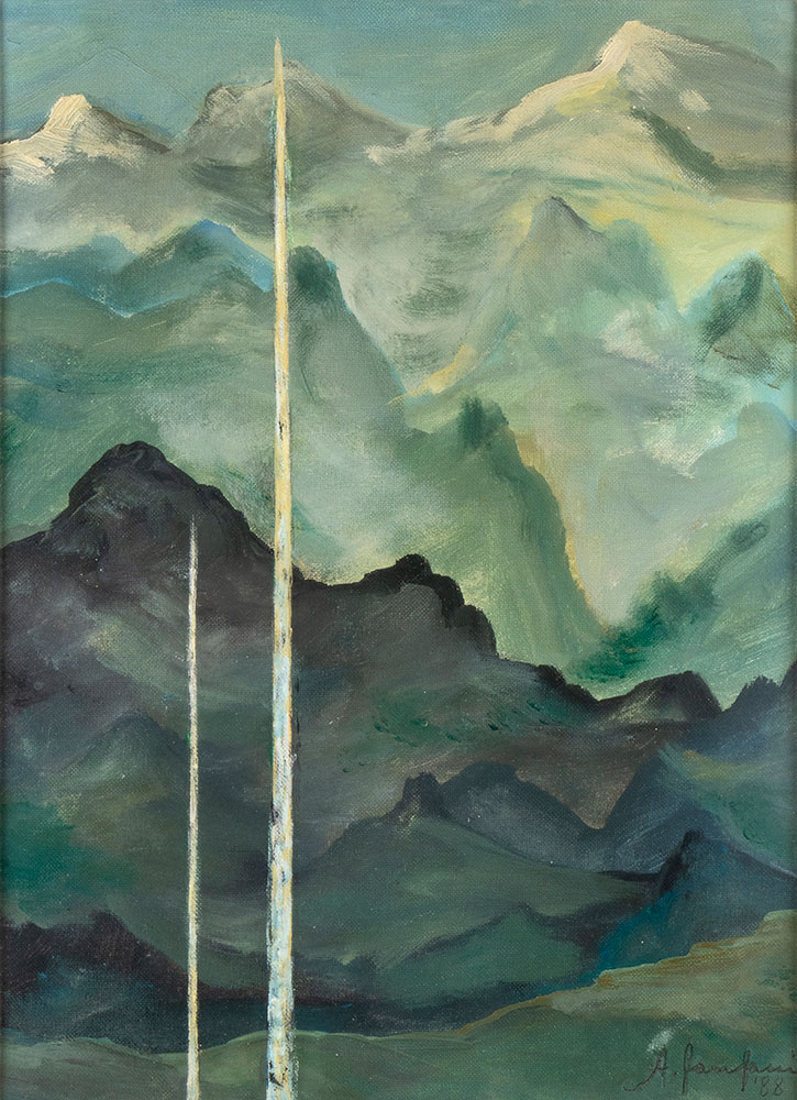 FANFANI, Amintore (Pieve Santo Stefano, 6 febbraio 1908 – Roma, 20 novembre 1999) Lotto di quattro composizioni originali "Vulcano" pennarello e matite 1980 (?) firmato, "Betlemme" pastello su carta 1977 firmato, "Paesaggio montano" olio su cartoncino 1988 firmato, "Luci nel bosco" olio su tavoletta 1955 firmato. In cornice