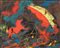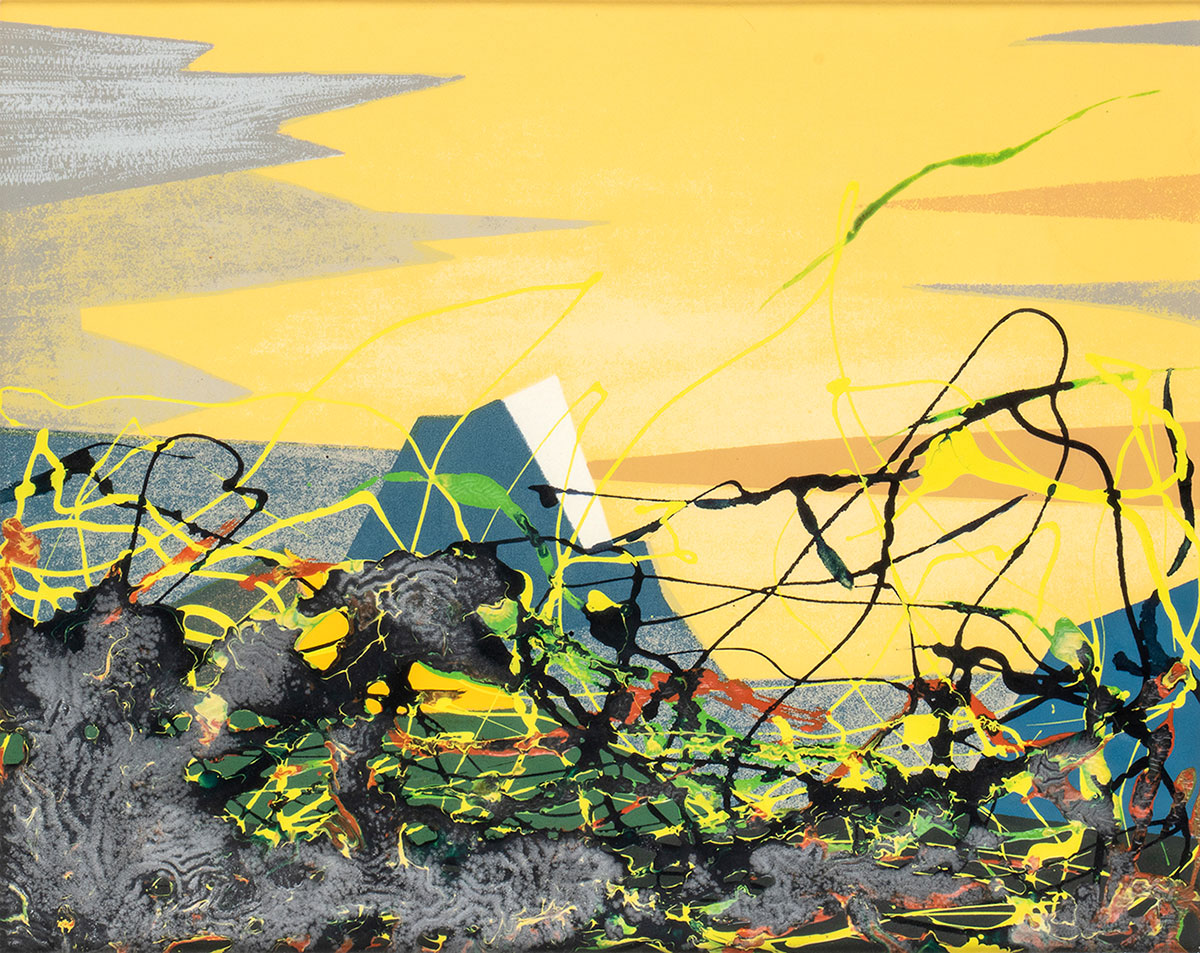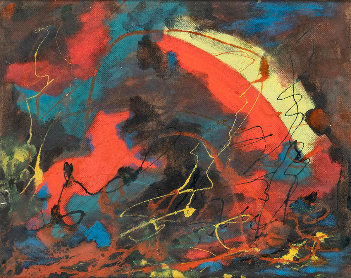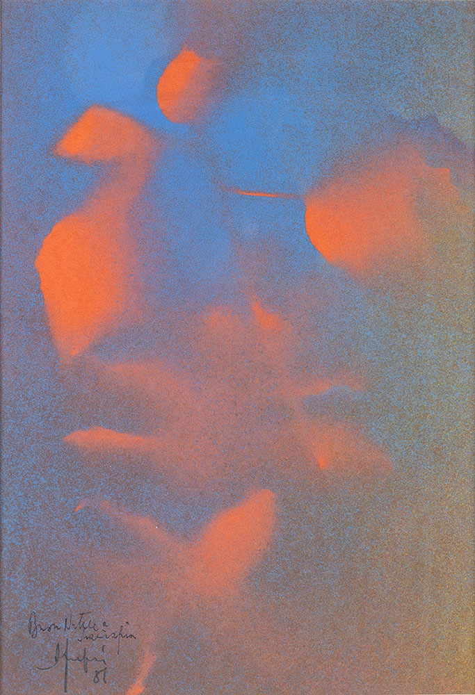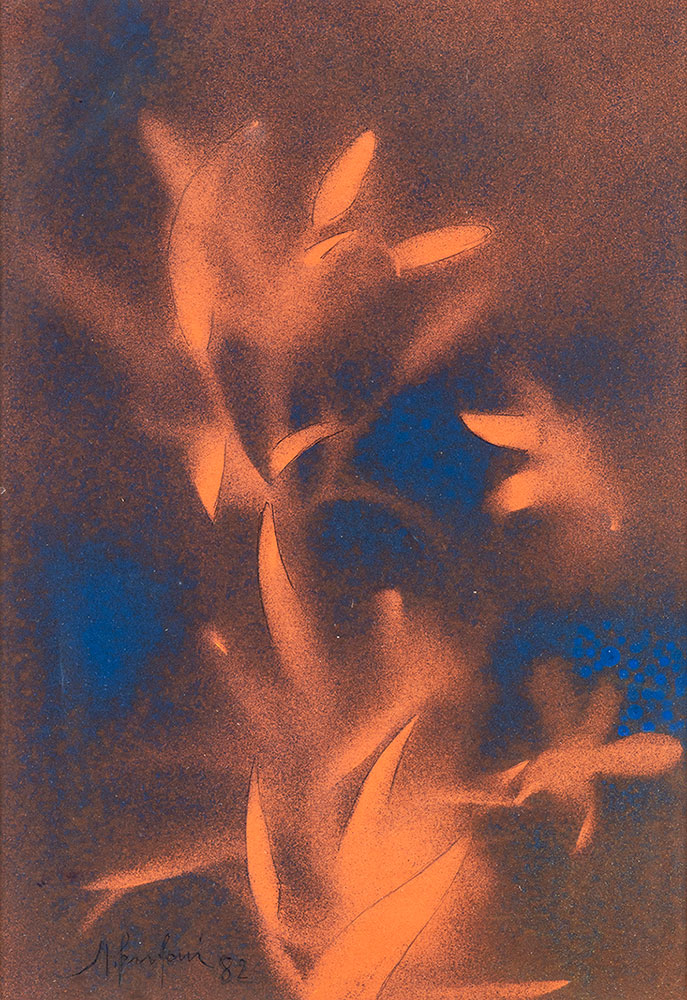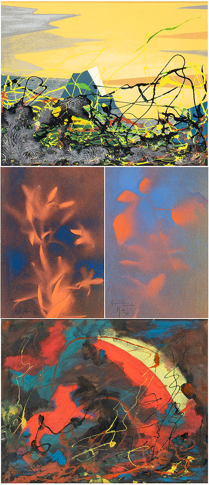 FANFANI, Amintore (Pieve Santo Stefano, 6 febbraio 1908 – Roma, 20 novembre 1999) Lotto di quattro composizioni originali "Lilium" pittura ad aerografo 1982 firmato, "Astratto" pittura ad aerografo 1981 firmato, "Fiamme" olio su masonite 1977 firmato, "Montebianco" serigrafia ritoccata a colori acrilici 1977 firmato. In cornice