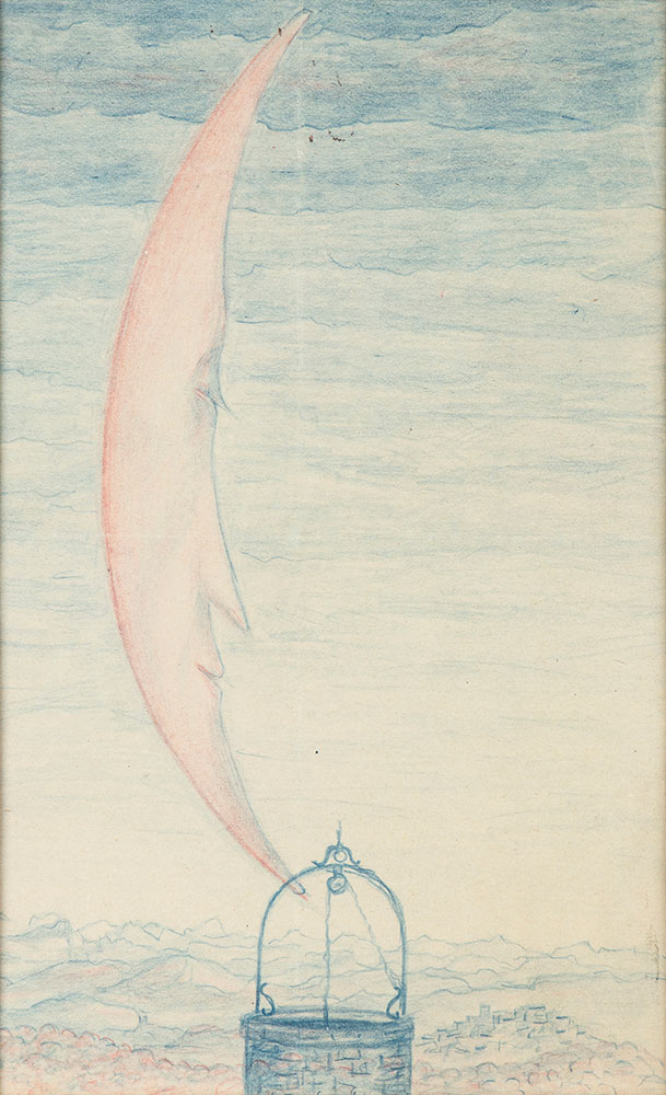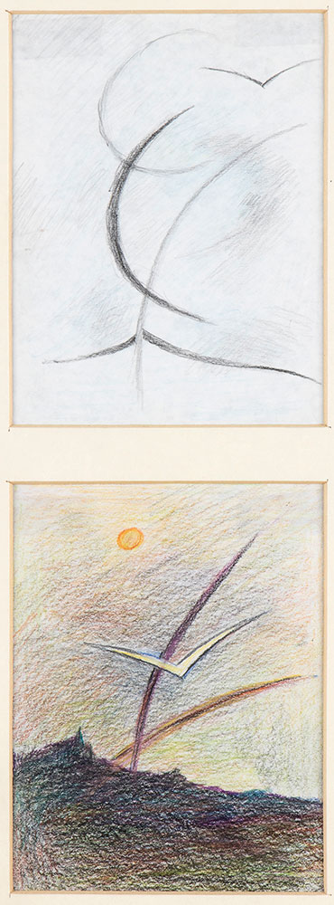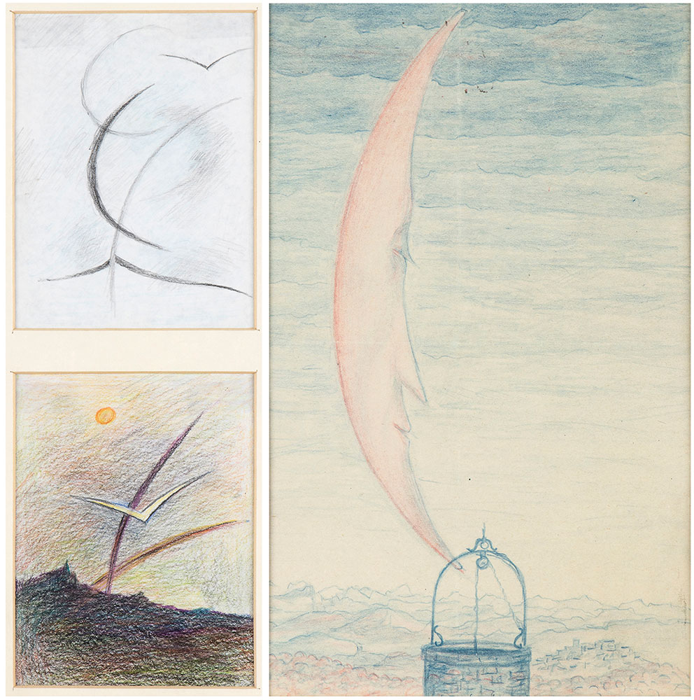 FANFANI, Amintore (Pieve Santo Stefano, 6 febbraio 1908 – Roma, 20 novembre 1999) Lotto di due composizioni originali "Gabbiani" matite colorate su carta firmate, ed un'altra dal titolo "La luna e il pozzo" matite colorate su carta 1959 (?). In cornice