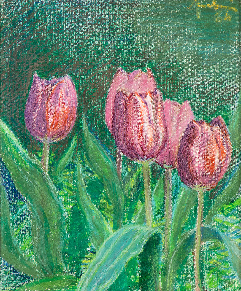 FANFANI, Amintore (Pieve Santo Stefano, 6 febbraio 1908 – Roma, 20 novembre 1999) Lotto di tre composizioni originali "Tulipani" olio su cartoncino 1984 firmato, "Ortensie" pastelli 1965 firmato, "Garofanini" tempera 1968 firmata. In cornice