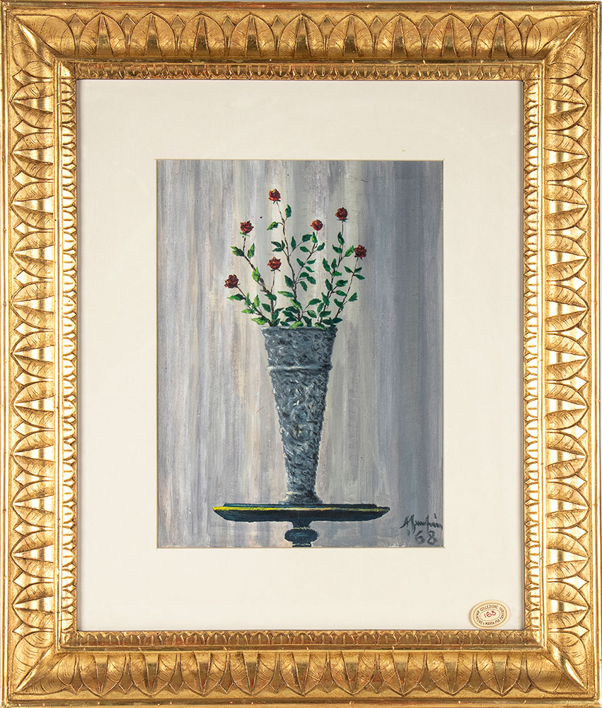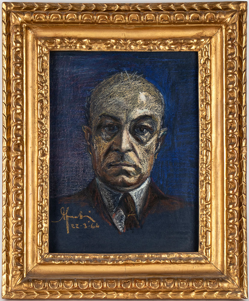 FANFANI, Amintore (Pieve Santo Stefano, 6 febbraio 1908 – Roma, 20 novembre 1999) Lotto di due composizioni originali firmate Amintore Fanfani "Vaso con rose" olio su cartoncino del 1968, e "Autoritratto" pastello grasso 1964. In cornice