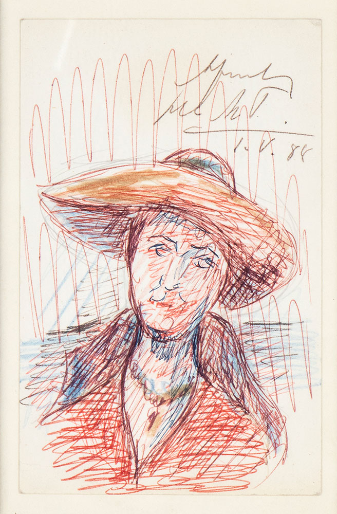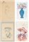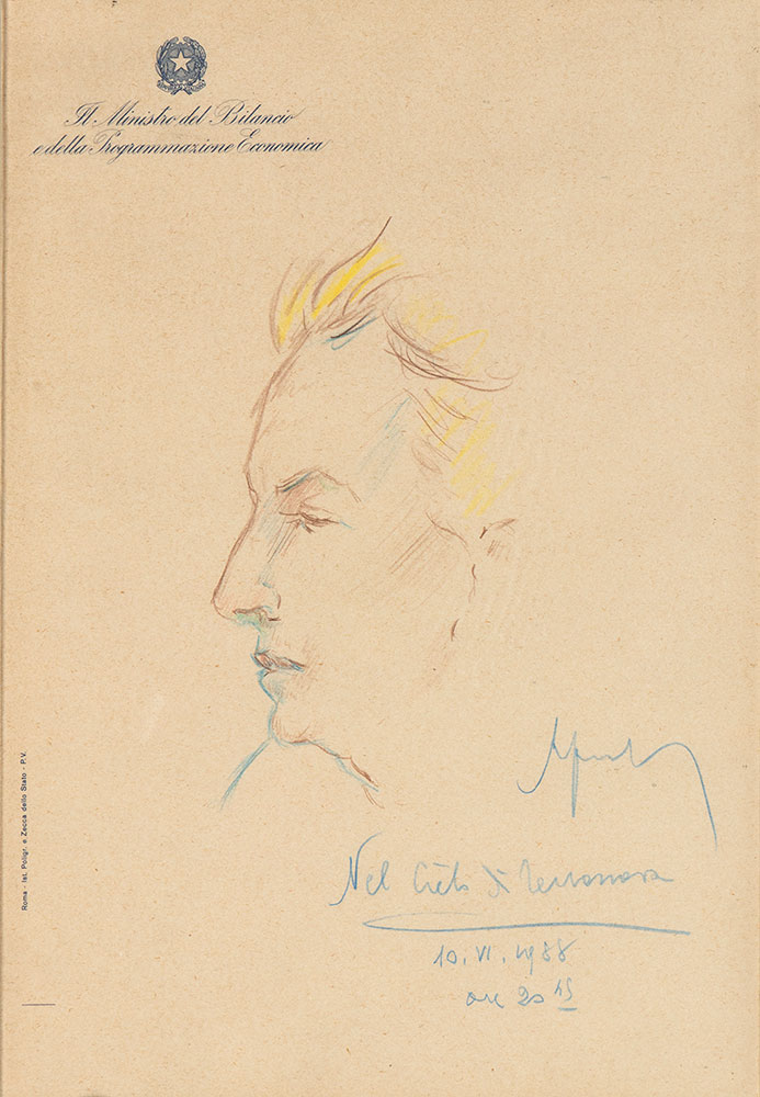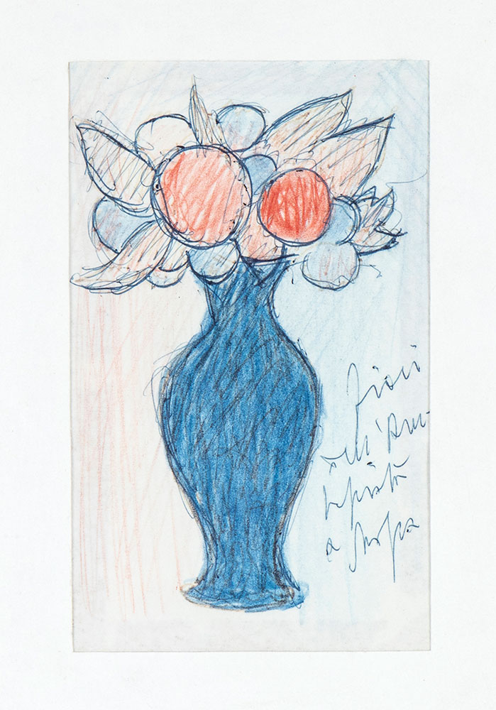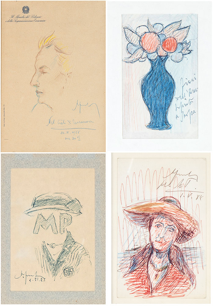 FANFANI, Amintore (Pieve Santo Stefano, 6 febbraio 1908 – Roma, 20 novembre 1999) Lotto di quattro composizioni originali firmate Amintore Fanfani "Nel cielo di Terranova" pastelli del 1988, vaso con fiori, ritratto di Mariapia con iniziali MP del 1983, altro ritratto del 1988. Tecniche varie. In cornice