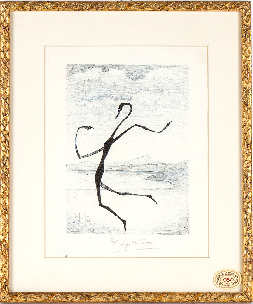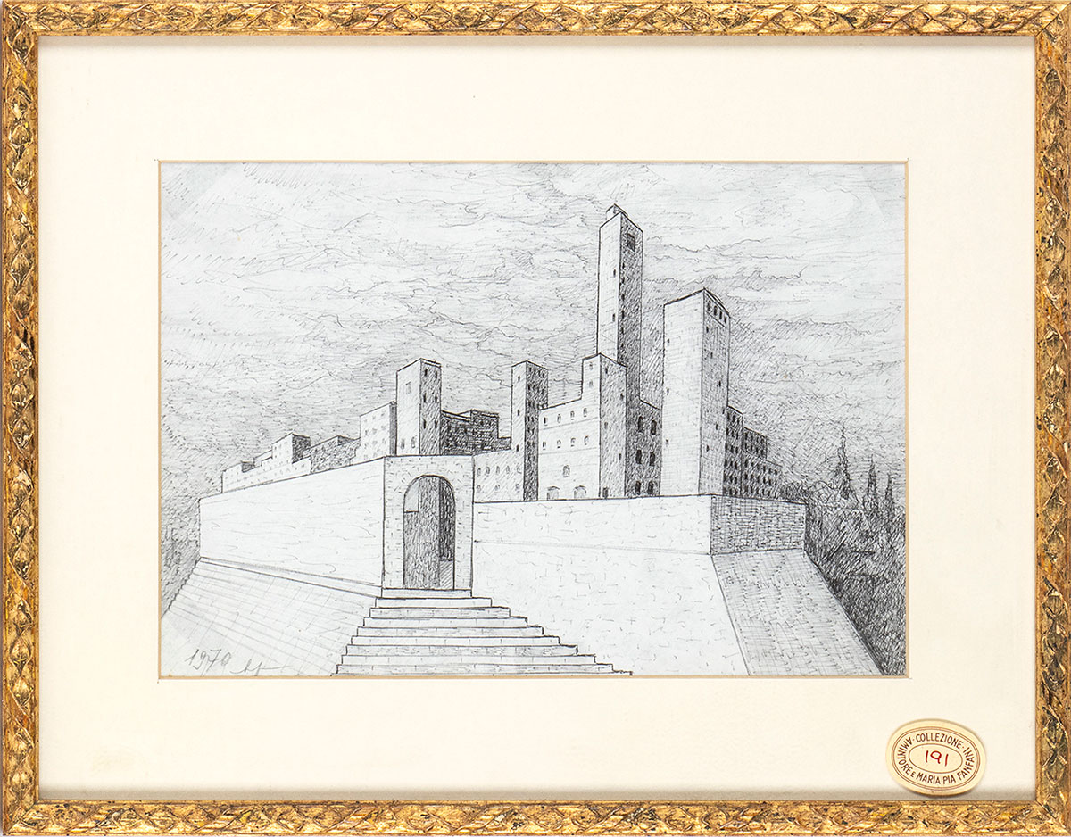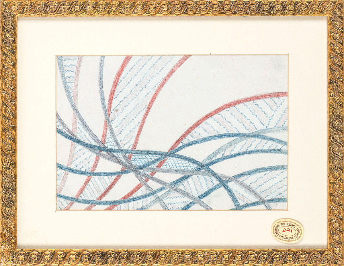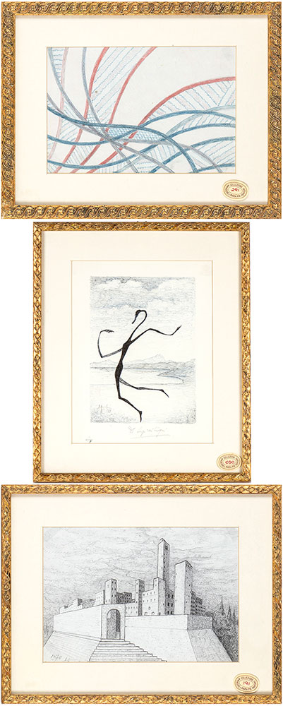 FANFANI, Amintore (Pieve Santo Stefano, 6 febbraio 1908 – Roma, 20 novembre 1999) Lotto di tre composizioni originali firmate Amintore Fanfani "Astratto righe rosse e blu" pastelli, "Il lago dei cigni" penna e matita 1961, "San Gimignano" (?) matita 1970. In cornice