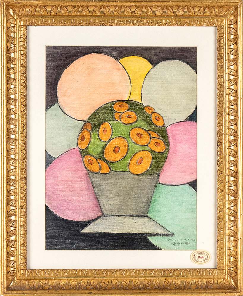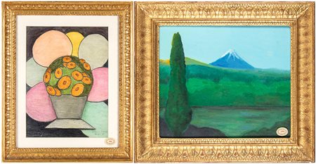 FANFANI, Amintore (Pieve Santo Stefano, 6 febbraio 1908 – Roma, 20 novembre 1999) Lotto di due composizioni originali firmate Amintore Fanfani "Omaggio a Klee" pastello 1970, "Monte Fuji" (?) olio su cartone. In cornice