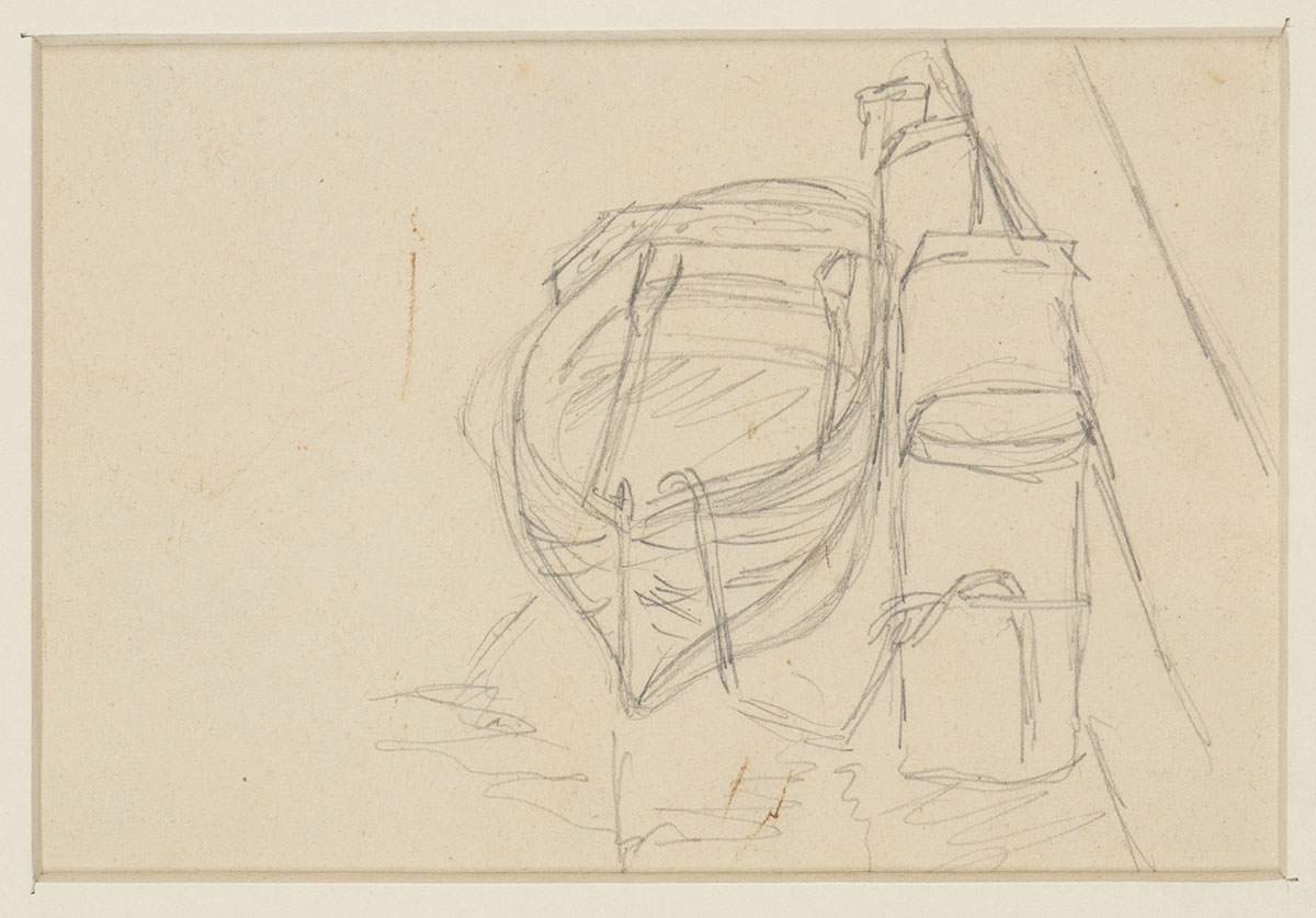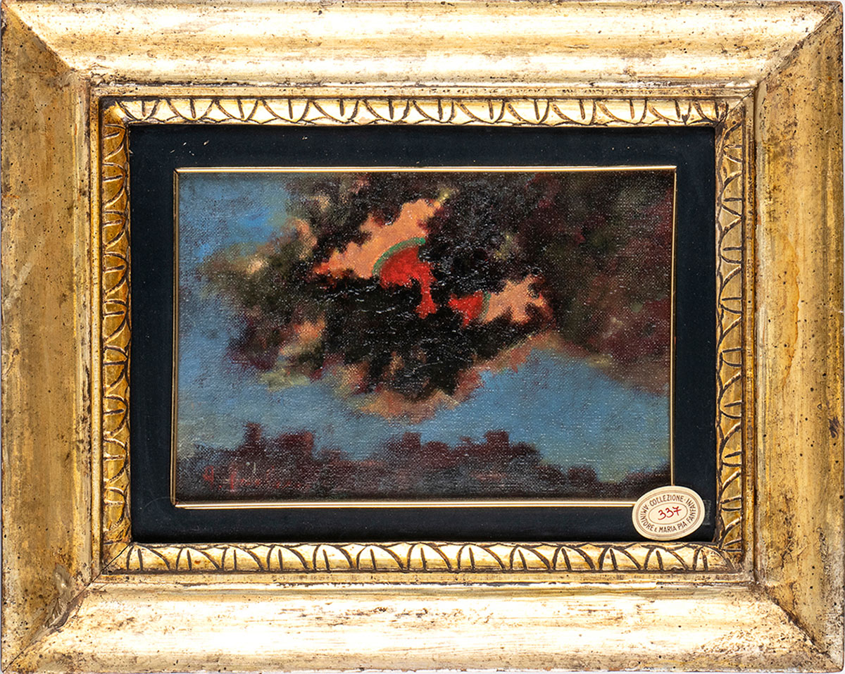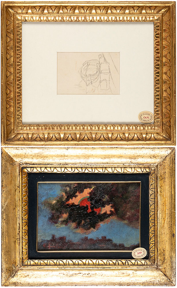 FANFANI, Amintore (Pieve Santo Stefano, 6 febbraio 1908 – Roma, 20 novembre 1999) Lotto di due composizioni originali firmate Amintore Fanfani "Barca al molo" matita, "Tempesta solare o sole apocalittico" olio 1986. In cornice