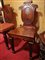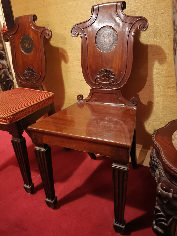 Coppia di sedie italiane in stile neo rinascimentale in legno, gambe a pilastro, schienale a forma di scudo ornato di monogramma finemente intagliate.