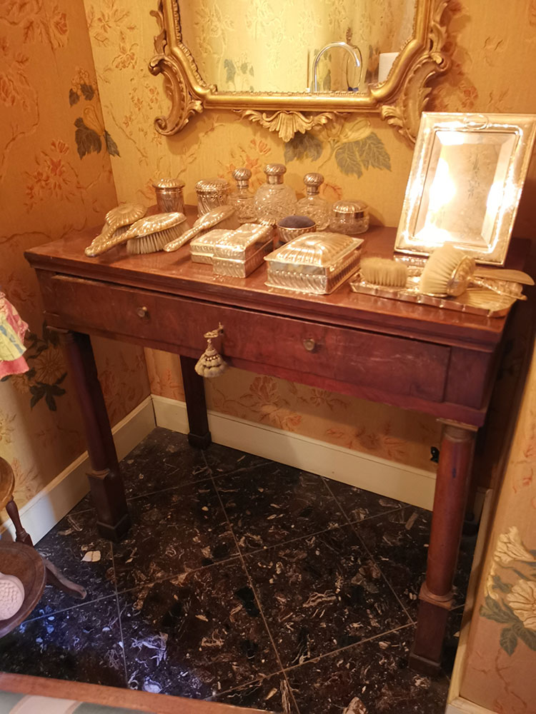 Tavolino francese in stile impero, un cassetto ed una sedia. Dimensioni: 88 x 44 x 77 cm.