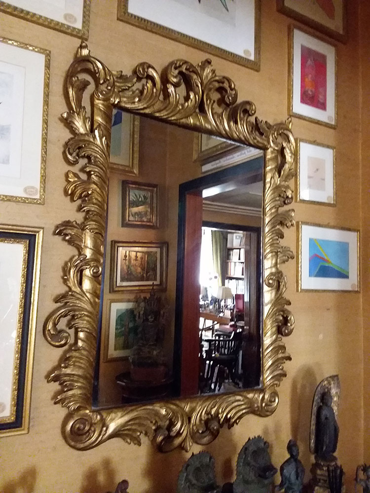 Specchiera cornice in legno dorato ornato di ricche volute. Dimensioni: 120 x 90 cm.