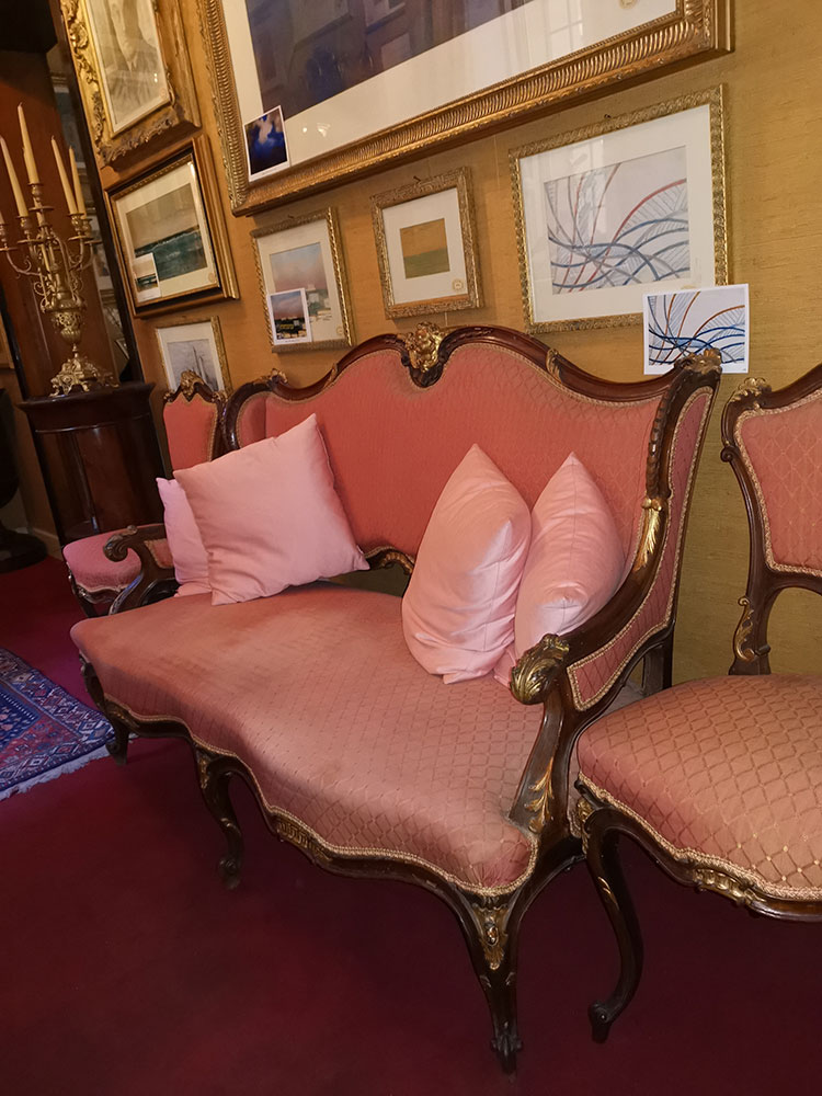 Divanetto e quattro sedie di linea sagomata con ornamenti dorati, spalliera e sedute imbottite ricoperte in stoffa rosa, stile '800.