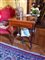 Tavolo da gioco ornato di intarso floreale, piano apribile a fazzoletto cassetto, gambe mosse raccordate sotto il piano da pianetto di linea mossa e terminanti a rotellina. Stile francese. Dimensioni: 58 x 58 x 73 cm.