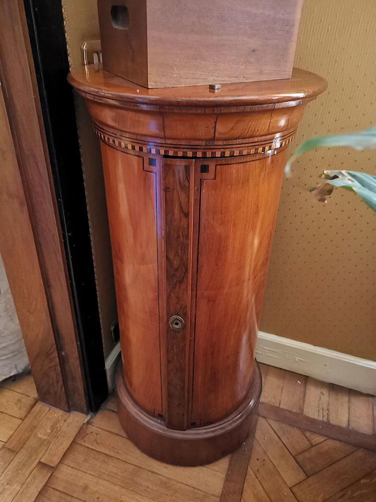 Comodino a colonna con sportello anteriore. Altezza: 87 cm.